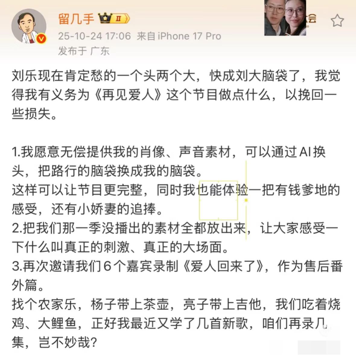 再爱5制片人刘乐喊话留几手别添乱了! 哈哈哈,《再见爱人》5因为嘉宾退出乱成