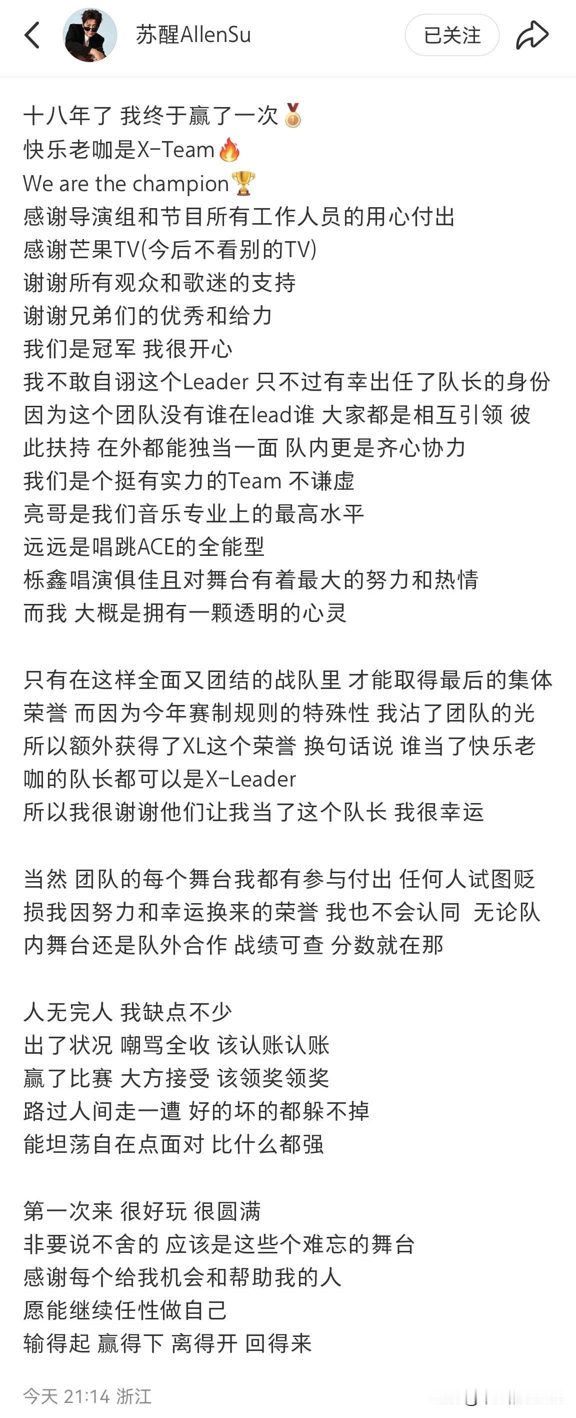 10月24日,苏醒发文告别综艺《披荆斩棘5》,也是我们俗称的“小作文”。苏醒还是那个苏醒,敢说敢做,敢于直面批评。 首先,苏醒说:“18年来了,终于赢了一次”。 他是07年《快乐男声》西安赛区冠军,亚军是陈楚生。但陈楚生在总决赛赢了苏醒,成为冠军。 比赛就是这样,谁都不能是常胜将军。 苏醒感谢了导演组、节目组工作人员、芒果TV、观众和歌迷,没有节目组的邀请和朋友们的支持,快乐老咖队不可能获得“团体冠军”。 其次,苏醒直言自己能得到“X-leader”荣誉是因为他出任了快乐老咖队的队长,有运气的成分在里面。 苏醒表示:小亮哥音乐水平最高,张远唱跳全能,王栎鑫唱跳俱佳,但他却已“而我 大概是拥有一颗透明的心灵”自嘲。 苏醒说今年《披荆斩棘》规则特殊,只有团体冠军,只要谁当快乐老咖队的队长,都可以是X-leader。 最后,苏醒来了一个巨大转折,表演出了状况,他认账,赢了比赛,他也大方领奖。 我很喜欢醒哥说的这句话,他说:“输得起,赢得下,离得开,回得来 。” 当年,苏醒与前公司解约,他差不多10年没上湖南卫视。再就业男团走红后,苏醒又成了节目组的争抢对象,他也能凭实力回归湖南卫视。 恭喜快乐老咖队荣获“X-team”荣誉,恭喜苏醒荣获“X-leader”荣誉,实至名归。 对于苏醒发文告别《披荆斩棘5》,大家有什么想说的?