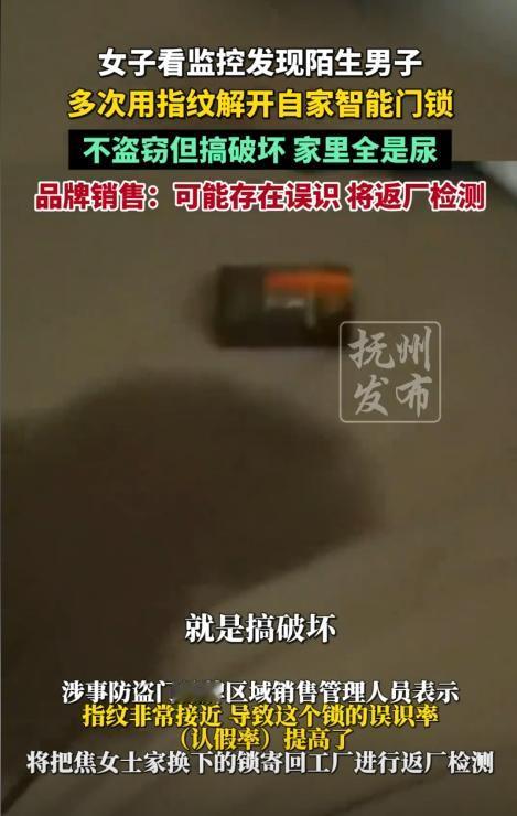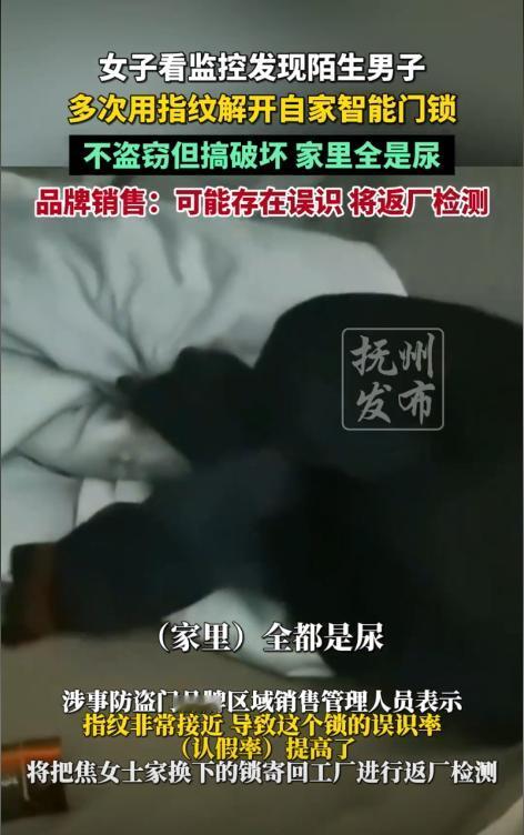 北京,一女子回家后闻到一股臭味,就连自己的床上也有。她怀疑有陌生人进屋,于是查看了监控,结果发现一陌生男子用指纹打开了家里的智能锁,不仅在她的床上睡觉,还在屋内随意小便,这让女子一阵后怕。然而厂商却表示:指纹高度相似也不是没有可能。(来源:抚州发布) 据悉,焦女士在2024年给家里换了防盗门,该防盗门采用的是智能锁。 今年的10月19日,焦女士回家后闻到一股怪味,像是尿骚味,而且自己的床上也有股臭味。焦女士怀疑是不是有人进过家里,但她左思右想,除了自己最亲近的人,没人知道自家的密码。 为了以防万一,焦女士调取了自家监控,结果发现有一名陌生男子进入过自己的家,还在家里到处撒尿,甚至还睡在了焦女士的床上。 焦女士吓坏了,她又去调取了楼道监控,结果发现这名陌生男子是通过指纹锁进的房间。 据焦女士透露,这名陌生男子一开始疯狂按家里的门铃,之后又拉了下门锁,谁知门锁突然发出"已识别"的提示音,门马上就打开了。 男子当时还愣了几秒秒,然后关上门又试了两次,都精准识别了指纹。不过男子并没有进屋,而是转身就走了。 次日早上6时,这名男子又来到焦女士家门口,光着脚穿着双拖鞋。男子熟门熟路地用指纹打开了门锁,堂而皇之的进了焦女士的家里。 之后男子就像回到了自己的家,直奔卧室后脱了外套就倒在床上呼呼大睡,睡醒了就到处撒尿。 焦女士看着监控内的画面,感到无比的崩溃,她果断报了警。然而报警后她才知道,这个举止怪异的男子真的不正常,他有医院开具的精神病的证明。 《治安管理处罚法》第13条规定,精神病人在不能辨认或者不能控制自己行为的时候违反治安管理的,不予处罚,但是应当责令其监护人严加看管和治疗。间歇性的精神病人在精神正常的时候违反治安管理的,应当给予处罚。 也就是说,如果这名男子在事发时,精神疾病正在发作的,那警方不会予以治安处罚。 可从男子的行为来看,并不像是精神疾病患者,所以希望警方能进一步调查。如果男子在事发时精神疾病并未发作,那必须予以治安处罚。 此外,由于男子在焦女士家到处撒尿,还睡了焦女士的床,一旦焦女士请人来打扫或换床,就可能产生费用,这些损失都需要男子的监护人来承担。 其次,售卖防盗门的商家和品牌方也逃脱不了责任。 事发后,焦女士在第一时间联系了防盗门的品牌方,对方称可能是因为焦女士和该男子的指纹极为接近,所以导致智能锁识别错误了,但这种情况的概率很低。 对于品牌方的说法,焦女士自然难以接受,概率低不代表不会发生,现在家都被弄成这样了,怎么能如此的轻描淡写就过去了? 目前,品牌方表示会把焦女士家的智能锁返厂检测。 有网友表示,这着实有点让人害怕,要是焦女士当时在家,那说不定还要遭到该男子的迫害,谁还敢用智能锁? 还有网友表示,现在的智能锁还没有达到绝对安全的程度,有时候还会自动开门,还是用钥匙锁比较靠谱。 根据《GA374-2001电子防盗锁》的规定,电子防盗锁的误识率不超过0.1%。 也就是说,电子防盗锁是没办法做到绝对的0失误的,只要不超过0.1%就算是合格的产品。 既然如此,男子误开了焦女士家的防盗门,还真有可能是误识。不过即便如此,商家也需要对防盗锁进行相应的检测,看看误识率是否超过0.1%。 如果超过了,那就说明产品质量有问题。焦女士作为消费者,有权要求品牌方予以更换,或者退货退款,并补偿焦女士的损失。 如果防盗锁没有任何问题,那焦女士可能以后都不能使用防盗锁了,因为防盗锁没有问题就说明男子和焦女士的指纹十分接近,即便换成其他的防盗锁,也有可能出现误识。 最后,焦女士的遭遇的确让人毛骨悚然,不过也幸好发现得早,否则一直让这个安全隐患存在,万一哪一天又有人的指纹和焦女士的极为相似,那就太危险了。 对此,您怎么看?欢迎留言交流。