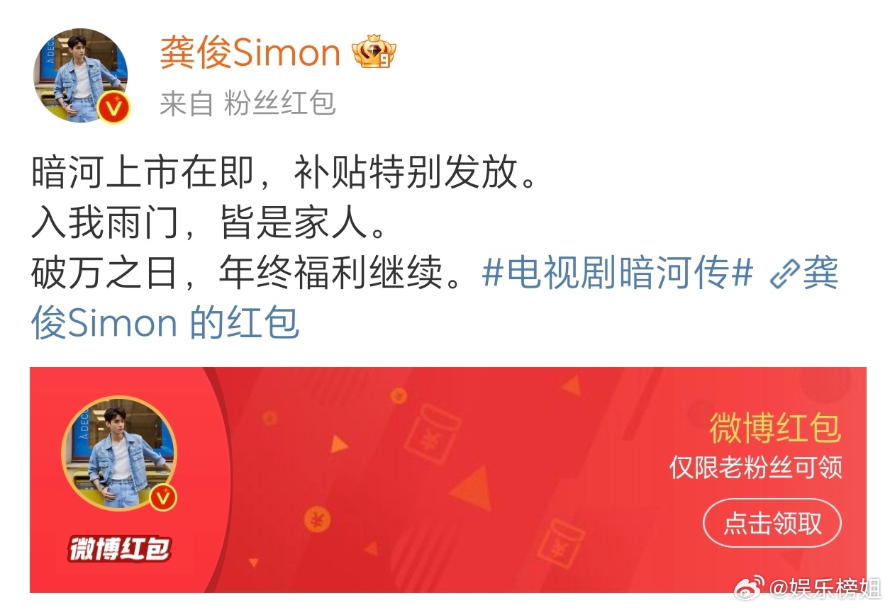 龚俊破万福利 龚俊发红包庆祝暗河上市,而热度破万之日,福利将继续。好大方的苏暮雨,破万冲冲冲!!![送花花]电视剧暗河传