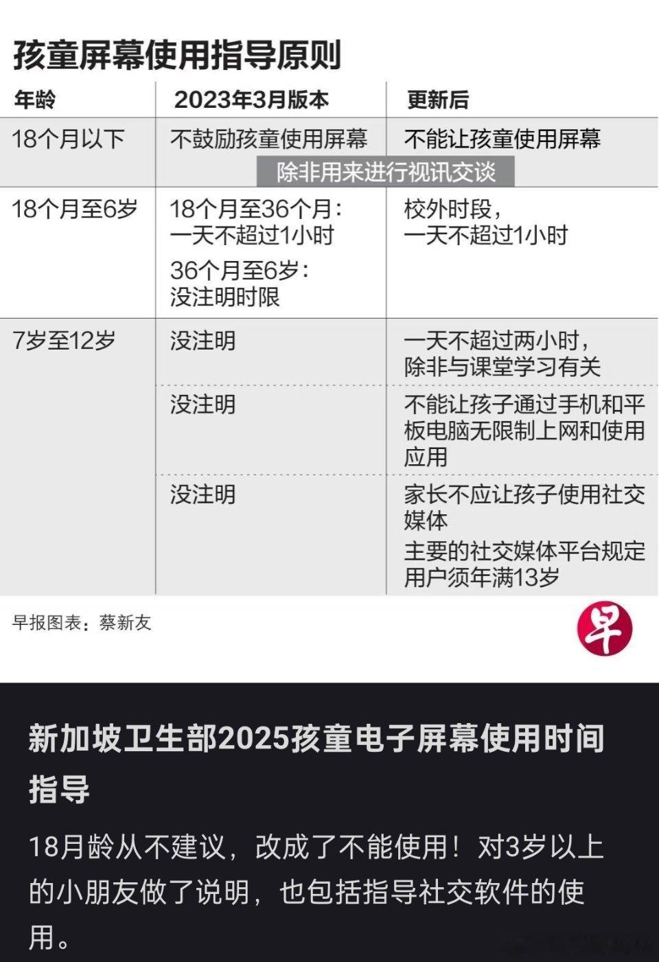 🔻小孩子几岁才能可以玩手机?这是新加坡的电子屏幕使用指导图。7岁后一天不能超过2小时,13岁之后才能使用社交媒体。[哆啦A梦吃惊][哆啦A梦吃惊]