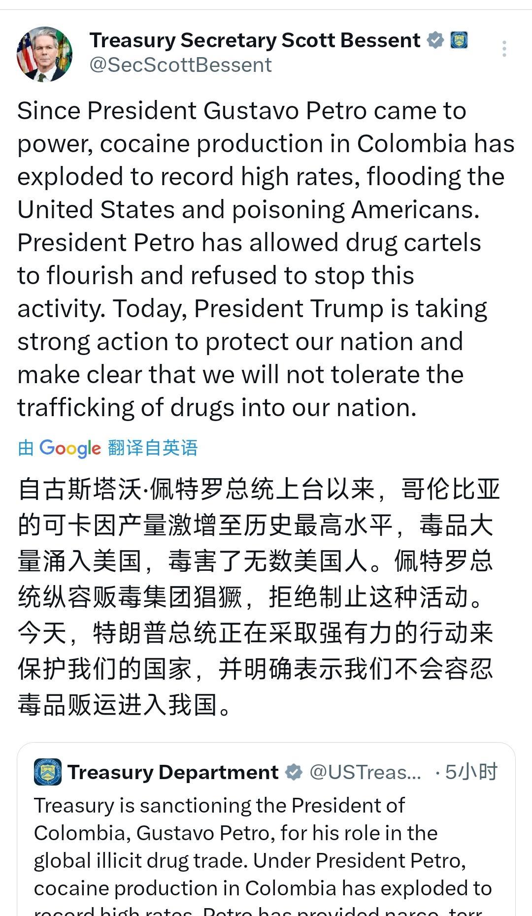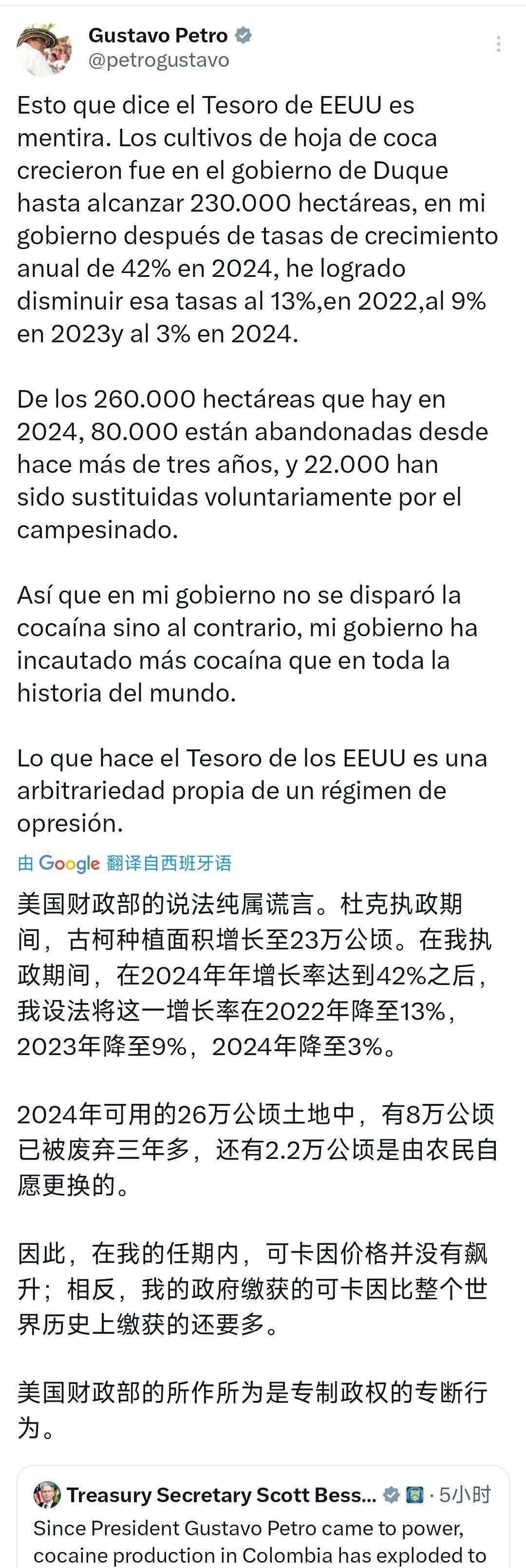 美国财政部对哥伦比亚总统佩特罗、他的妻子和儿子,以及内政部长实施了制裁,声称佩特罗与非法毒品交易存在关联。 在2024年的26万公顷种植面积中,有8万公顷已经撂荒超过三年,还有2.2万公顷已被农民自愿改种其他作物。 所以,在我执政期间,可卡因产量并未激增,恰恰相反,我的政府缴获的可卡因数量超过了世界历史上任何时期。 美国财政部的所作所为是典型的压迫政权的专横行为。 ”