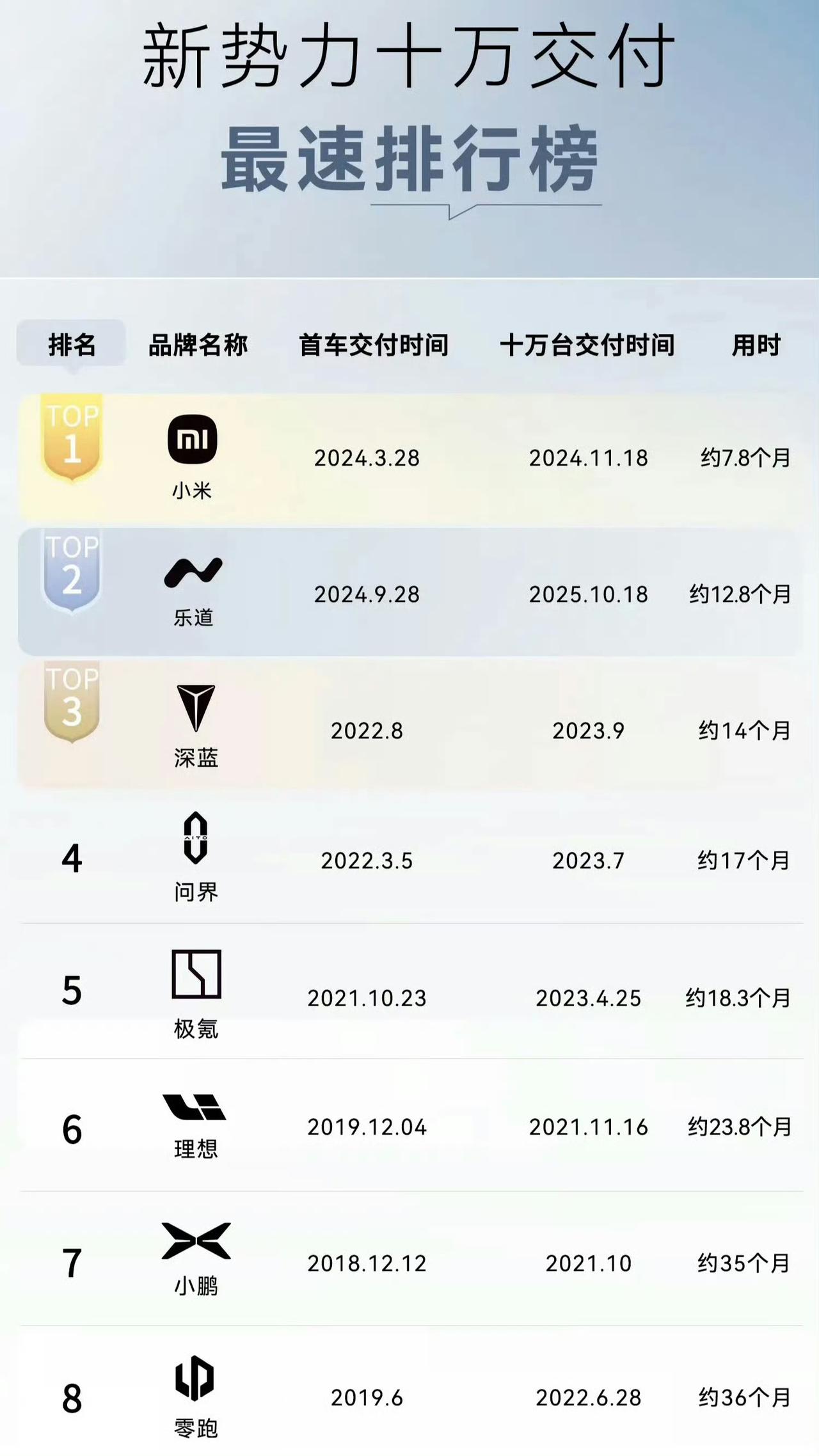 乐道是新势力达成十万交付第二快的品牌,仅次于小米这个bug ! 小米达成10万辆交付成绩真的是非常的快,仅用了7.8个月就达成了这个成绩。 不知道现在有没有新品牌能做到这个成绩,如果有新品牌的话,那也是非常成熟品牌下面的子品牌才能做到这个成绩,否则的话应该没有企业有小米一样的号召力了。 其实还有一家企业有如此强大的号召力,但是他们不直接参与造车,大家知道是什么品牌吗?