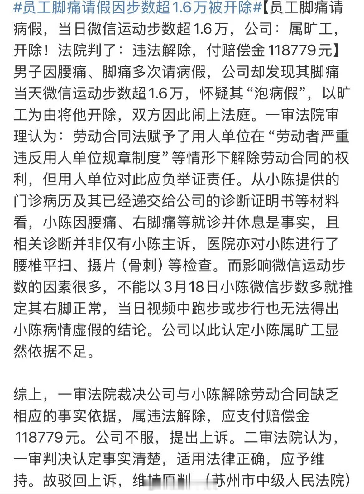 员工脚痛请假因步数超1.6万被开除法院判:违法解除,付赔偿金118779元。咱就是说去医院跑上跑下步数肯定少不了呀[泪奔]