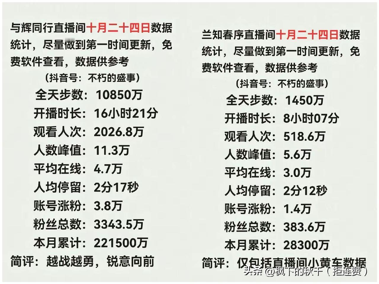 家人们,快来感受这份意外和惊喜!董宇辉又搞大事情啦! 每天给自己定个小目标,这带货能力,铁老头看了怕是要被气到病情加重!就说10月24号,与辉同行直播间没有搞什么特别专场,就是卖些衣服、包子这类日常吃穿用品,销售额竟然轻松破亿!与辉同行当日入账1.08亿,还涨粉3.8万,本月总GMV直接飙到22.15亿;兰知春序也表现不俗,斩获1450万销售额,涨粉1.4万,本月总GMV达2.83亿。这成绩,谁看了不得说一声牛! 再看25号,宇辉现身杨凌农高会,被三位农业专家团团围住,一起探讨现代农业新知识。可别小瞧这些知识,觉得用不上就没用,要知道知识可是永远的财富,说不定哪天就能派上大用场! 董宇辉总能给大家带来意想不到的惊喜和成绩,他的每一次亮相、每一场直播都看点十足。家人们,你们觉得董宇辉下一次又会创造怎样的奇迹?快来评论区聊聊!
