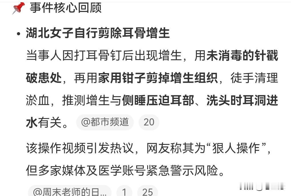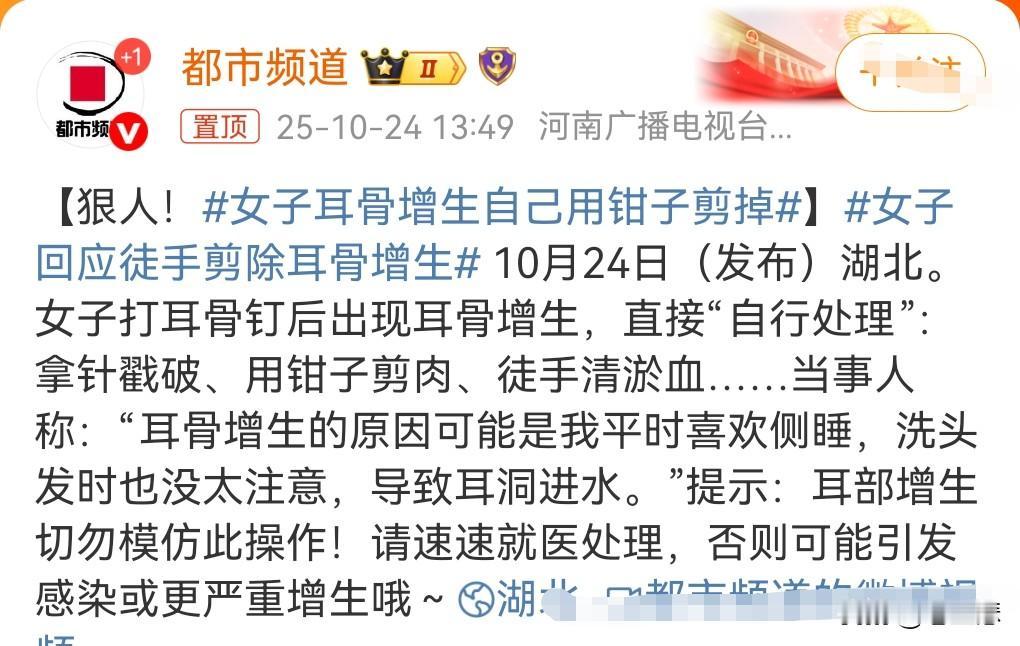 这种人真的是太狠了吧。 为什么不去医院解决呢?竟然自行解决,这真的是不知说什么好了。 10月24日报道,女子耳骨增生自己用钳子剪掉。 她竟然还拍成视频,真是看着都疼。 医生提起这么做的风险很大,有可能造成更大的增生。 身体出问题了,不要想着自行解决,不要拖,第一时间去医院快速解决。