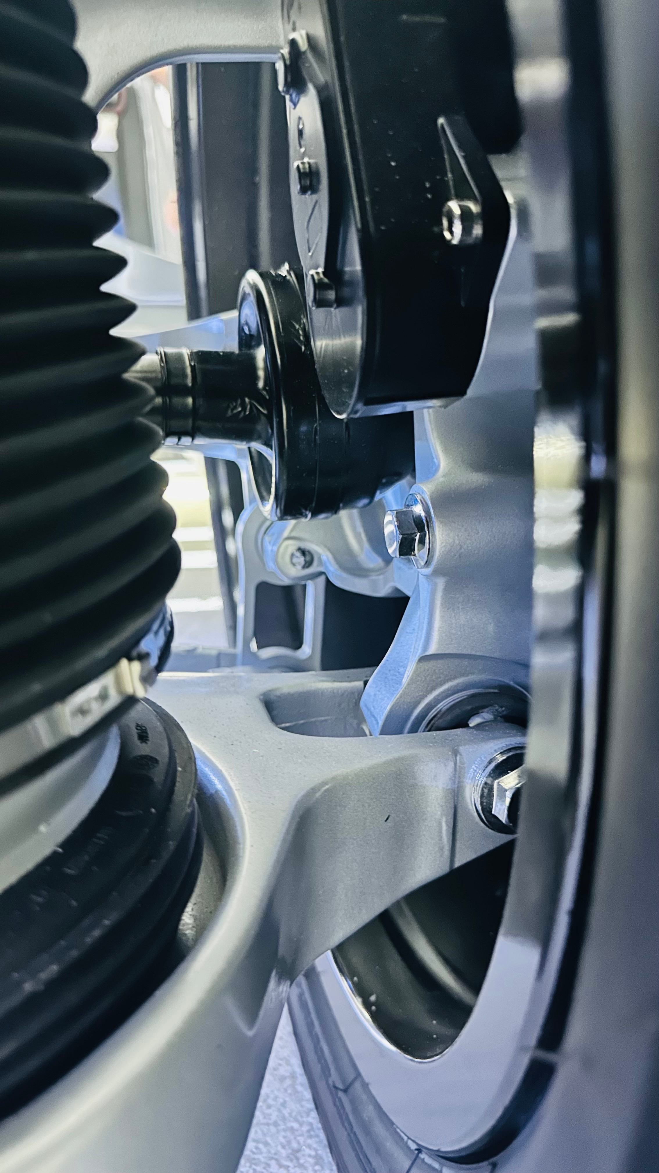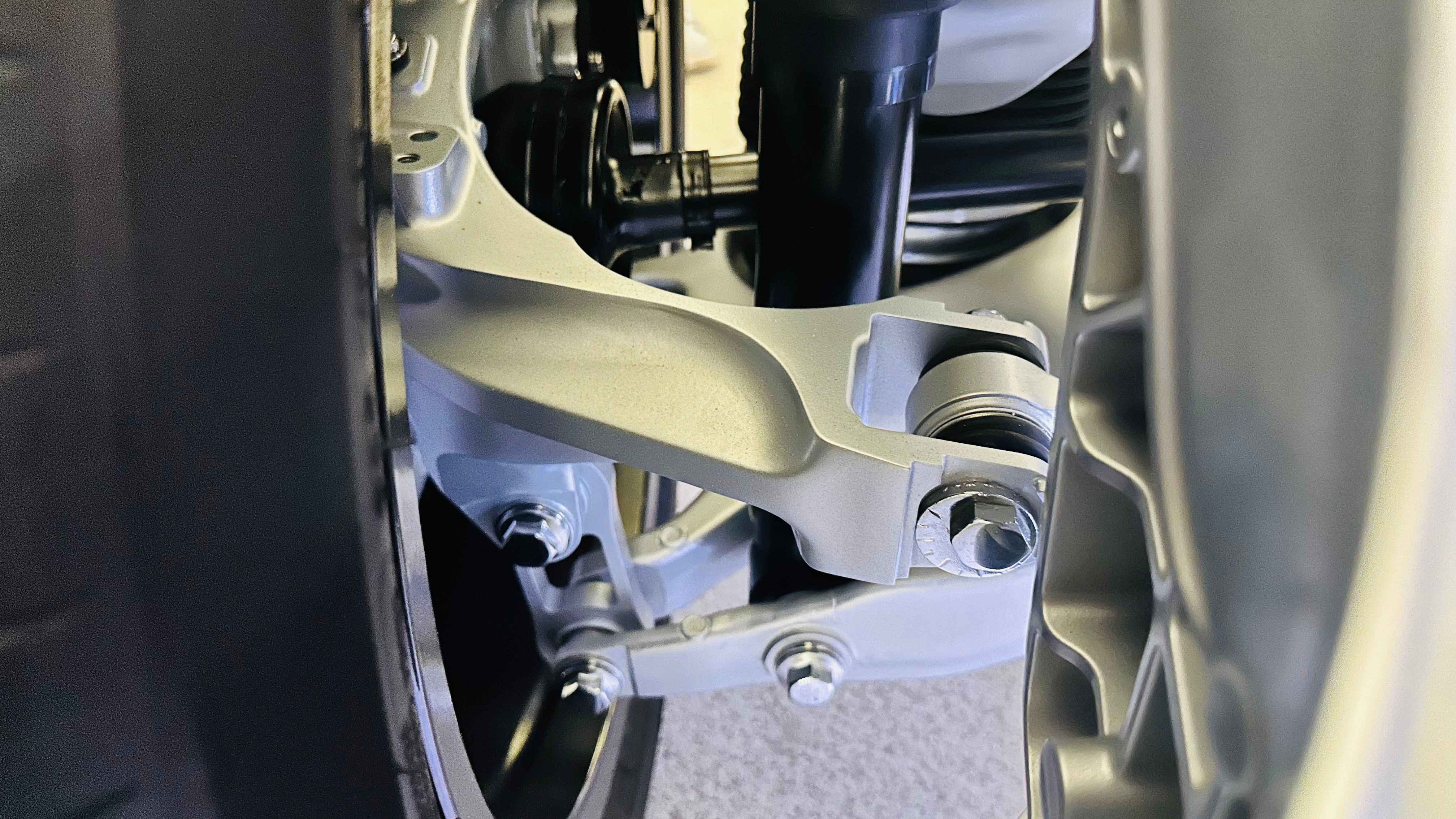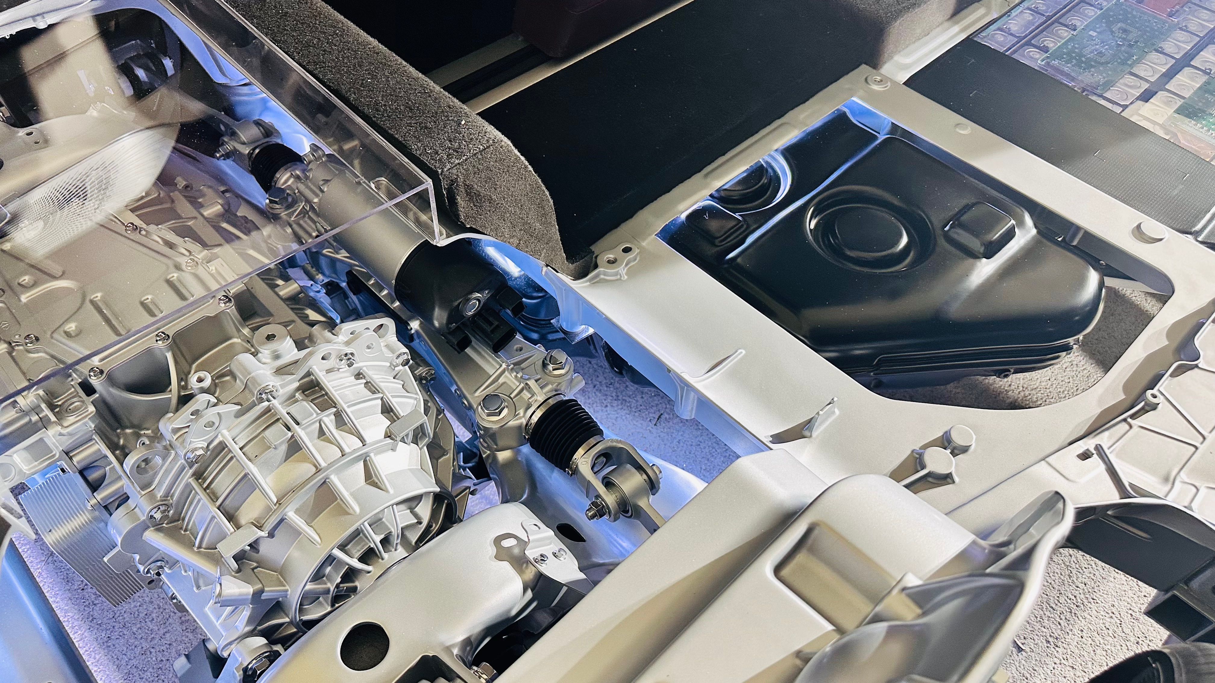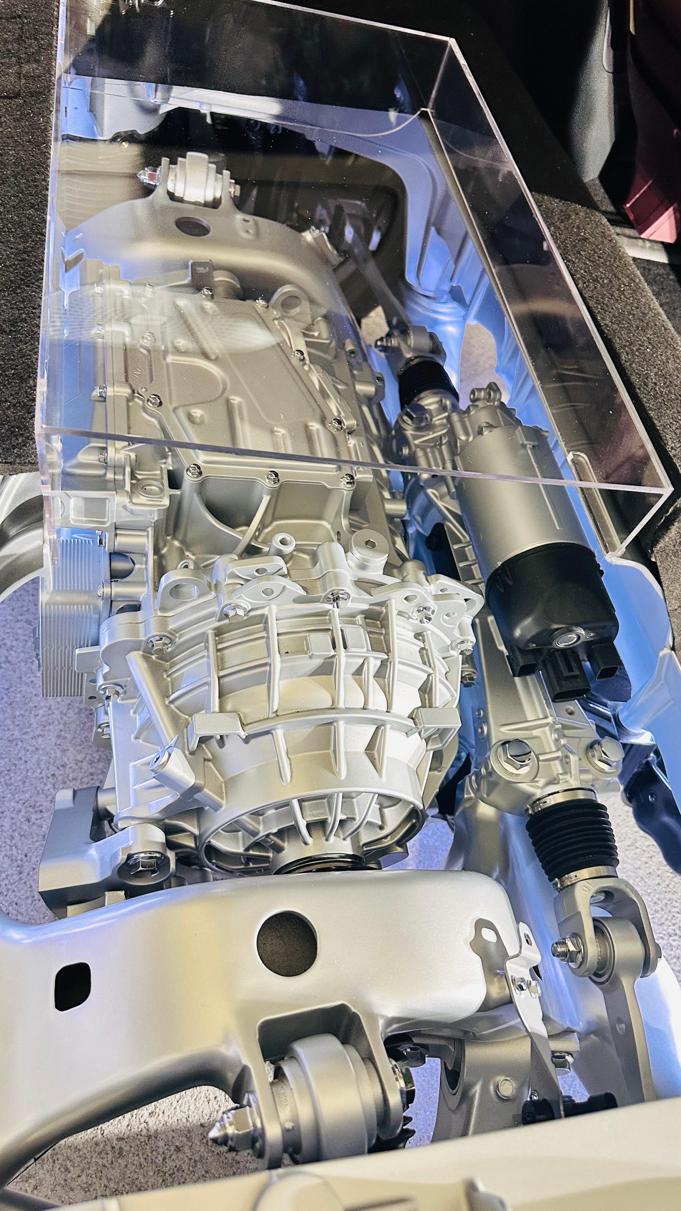 2,为了保留原有的后轮转向系统,使用了一台 X 向长度仅有 383mm 的同轴电桥。没有偏置布置,让电驱可以完美塞在后副车架中。同轴电驱需要使用行星排减速器,成本高,噪音控制也相对较难。但是依然做的不错。