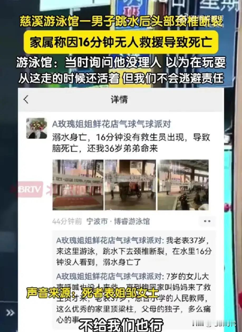 浙江一男子在游泳馆浅水区跳水颈椎断裂死亡!身份是体育老师。事发时有3名救生员,说是误以为父女在闹着玩。 10月18日,男子教7岁的女儿跳水姿势,结果跳水下去后颈椎严重受伤。7岁女儿一下子拉不动爸爸,也没求助也没喊叫。努力地把她爸爸抬起来后,就急忙赶去叫妈妈。 送医治疗无果,5天后去世,家属称出事16分钟没有救生员。要起诉游泳馆延误救援并追责。 这位体育老师才36岁,就这样没了。孩子没呼喊救命,也真是可惜! 不过,作为一位多次到游泳馆会游泳者而言,应该知道水深只有1.1米的浅水区跳水会很危险,而且馆内也明确禁止。头朝下跳水,违反安全常识。 几个救生员同时一起去吃饭这就是对工作的不重视。还将异常误判为“玩耍”,更是专业能力不足。 救生员应该轮流去吃饭,至少要有一个人在现场工作,否则出了意外难逃责任。 孩子爸爸自己疏忽大意了,只想着怎么教孩子正确的跳水姿势,忘记了是在浅水区! 有些过失自己可以承担,但这么长时间没有第一时间施救,游泳馆难辞其咎不是吗? 每个人都要遵守安全规则 ,它是守护生命的第一道防线。