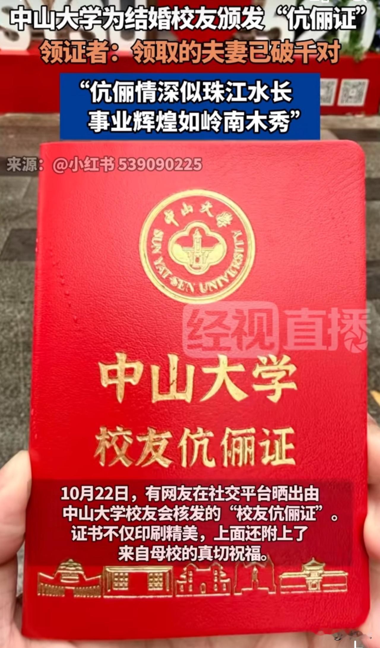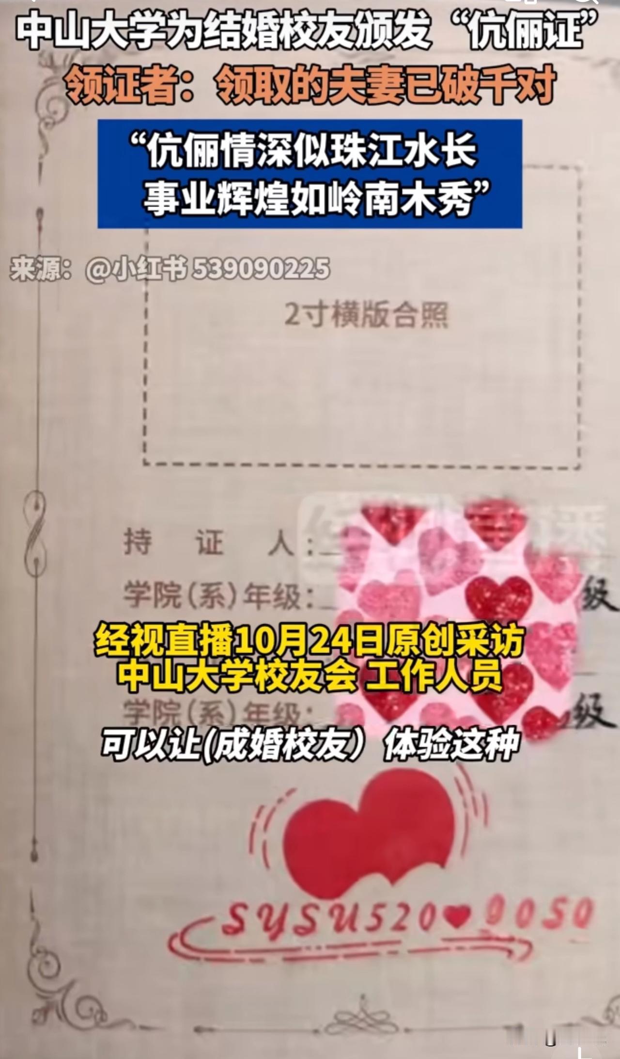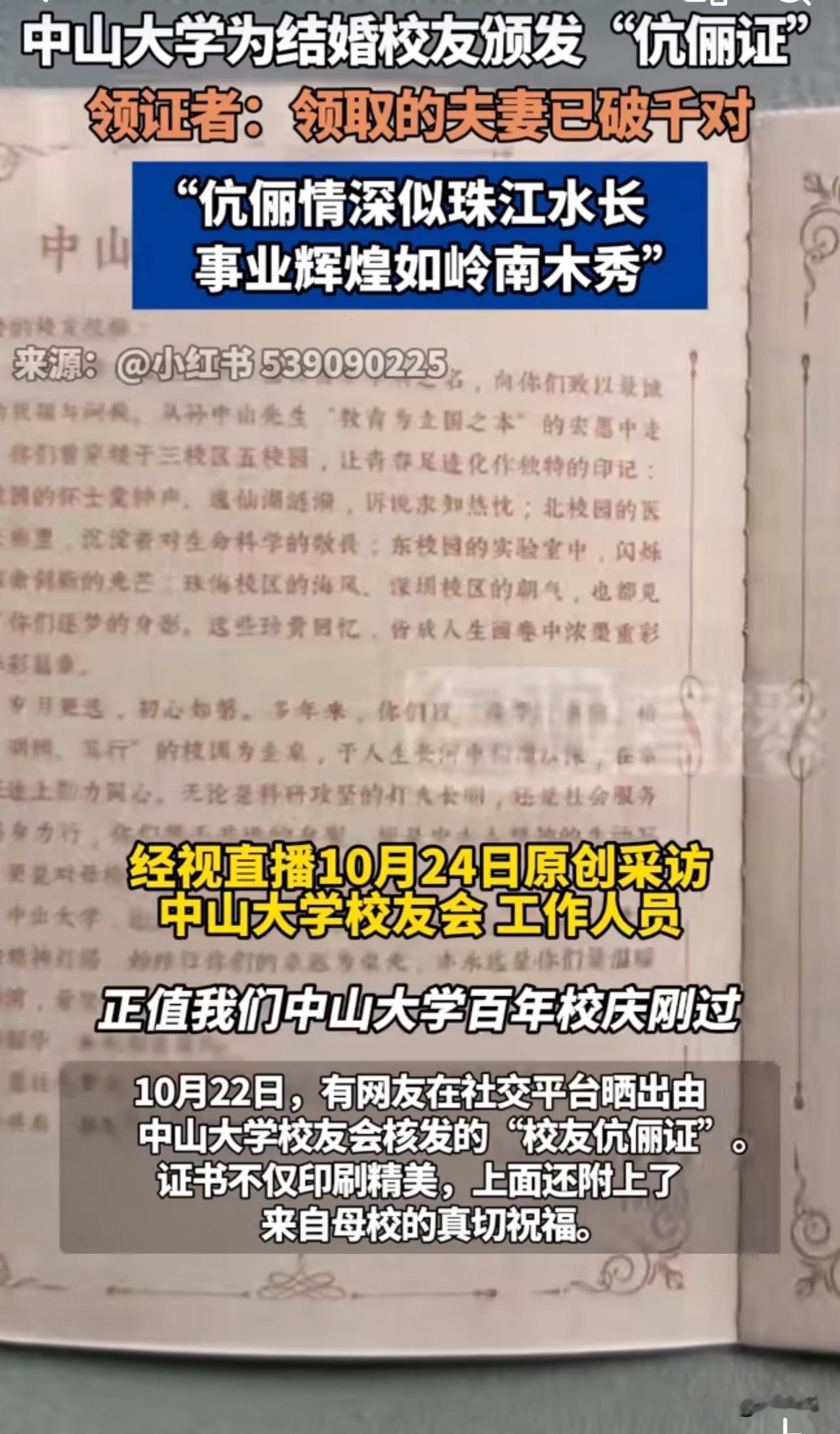 “中山大学的操作暖哭无数人!”近日,有校友晒出由校友会核发的“校友伉俪证”,证书手写姓名班级,附母校祝福,精致又走心,发布者直言等了5个多月才到手,编号已超1000号。 据了解,这是中山大学百年校庆“520”推出的特别活动,需夫妻双方均为校友,提交结婚证、合照等即可申请,9月30日已截止。 校友会工作人员称,是为见证校友伉俪情深,送上真挚祝福,有校友感慨“离校二十载,校园仍是家园”。 针对中山大学这波操作,网友纷纷留言:“这波情怀拉满了!母校盖章的爱情太甜了”! 还有网友羡慕道:“羡慕这种从校园到殿堂的缘分,还有专属认证,特别是手写细节太戳人,比任何礼物都有纪念意义”。 看完中山大学这波操作,周少不得不说其实戳中了校友对青春与爱情的双重情怀。母校不仅是求知之地,更成了爱情的见证者,手写证书的温度,让“校友夫妻”的身份多了份专属仪式感。 客观的说,这种连接校园记忆与婚姻幸福的方式,既传递了母校温情,也让爱情有了更厚重的纪念意义。不得不说中山大学这波操作,真的暖心,让人感动。 对于中山大学为千对结婚校友发伉俪证,大家怎么看呢?#寻美三湘# #长沙新朋友#