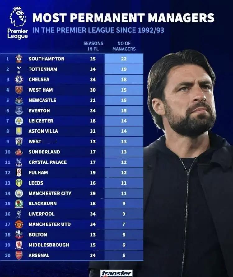 英超历史各队换教练次数排行榜,这个非常有意思。 南安普顿25个赛季英超,换了22个教练排第一。 热刺打满34个赛季,换了19次教练。 他们的老邻居阿森纳,才换5次教练,我感觉就是温格到阿尔特塔,做阿森纳教练真幸福![大金牙] 曼城,利物浦换教练次数一般,曼联主要这十年很频繁,以前只有弗格森。[可怜]