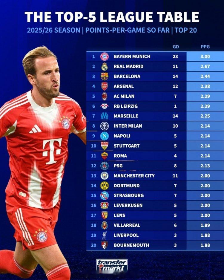 拜仁、皇马、巴萨、阿森纳分列前四,本赛季五大联赛场均拿分榜(及净胜球数):