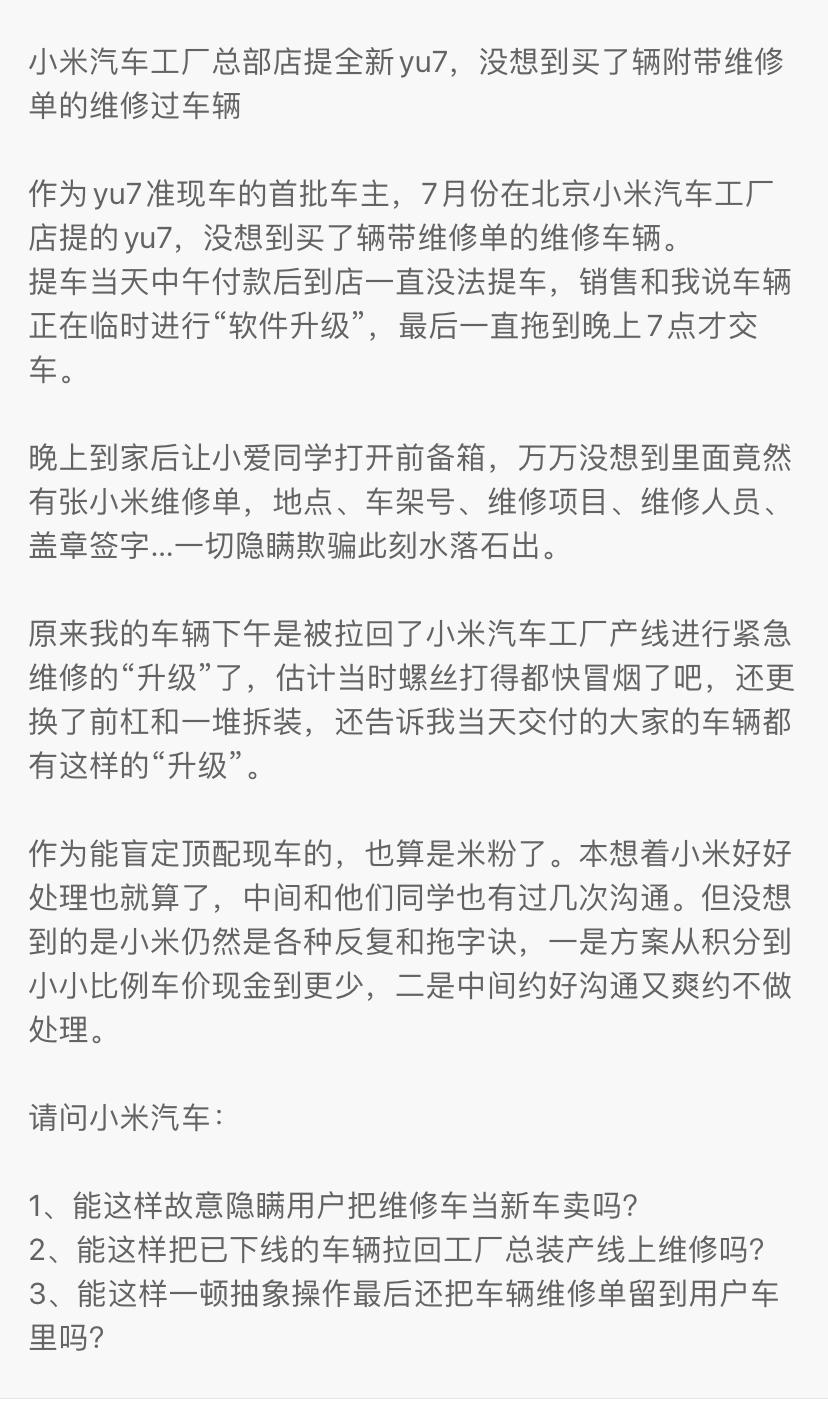 陈震:如果是真的,等等看官方说法和解决方案呗,我没啥看法~[思考] 一位小米车主购买到了带有维修工单的小米汽车,他在网上发文求助网络大v陈震,陈震看到了顺手转发了一下。 如果该车主说的是真的,那就比较有意思的,不知道能不能享受退一赔三的。因为该维修单的记录,是在车辆合格证之后出现的。 大家认为这件事是真的还是假的?欢迎评论区留言。
