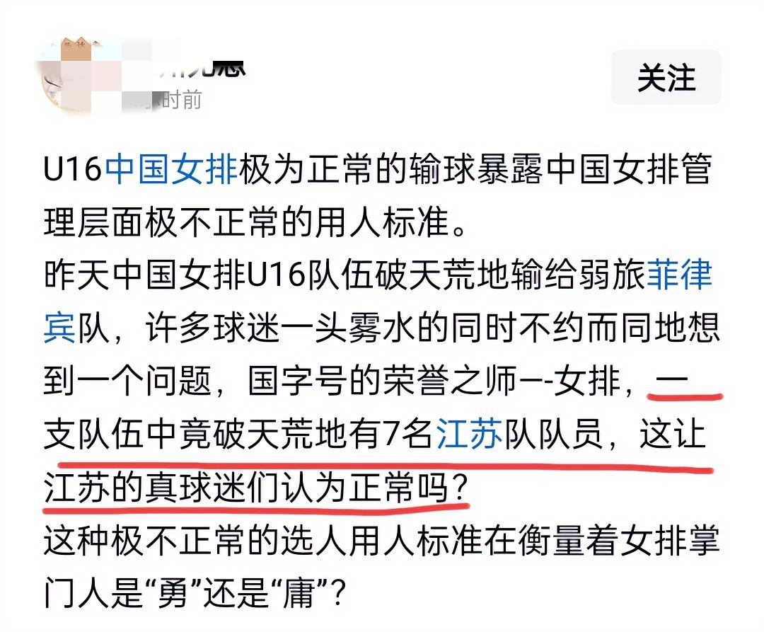亚青会中国女排0:3不敌菲律宾女排,天津独苗薛知铎三局砍下1分 当地时间10月23日,中国女排u16参加亚洲青年运动会,对阵菲律宾女排0:3输球,三局比分是:20-25、18-25、20-25。消息传回国内,某域球迷骂声一片,直接把责任推给4名江苏籍队员。 本场比赛,中国女排u16首发阵容如下: 主攻:孙雯煜(北京)、杨淼淼(云南) 副攻:徐睿琳(上海)、陈馨怡(江苏) 接应:薛知铎(天津) 二传:范元晟(上海) 自由人:顾茜茜(江苏) 主教练是何琦,助理教练是刘晓明、袁志。本场比赛,从亚排联公布的数据统计资料,主教练何琦基本上采取了一套阵容打到底的策略。本场比赛输球的原因,主要是中国女排的参赛队员年龄在16岁以下,菲律宾女排队员的年龄在19岁以下,平均年龄比中国女排大2.5~3岁,这是明显的大人打小孩,中国女排u16输球也是很正常的。 天津球迷把责任推给江苏球员,实在是不应该。我们来看数据统计资料,本场比赛江苏只有副攻陈馨怡和自由人顾茜茜上了场,其他几名江苏籍队员根本就没有上场。从得分来看,本场比赛中方最高得分是来自北京的主攻孙雯煜8分(19扣4中3拦1发),其次是来自江苏的副攻陈馨怡7分(20扣7中),另一名副攻、来自上海的徐睿琳7分(18扣7中)。江苏小将陈馨怡作为一名副攻拿到了第二高的分数,并没有给中国女排u16这支队伍丢脸。江苏优秀队员张一佳、高嘉咛等队员上场的机会都没有,天津球迷把输球的责任推给江苏球员明显是无稽之谈。 值得一提的是,天津独苗薛知铎,主打接应位首发打满三局只拿到一分。有球迷调侃,为什么天津籍队员在国际上场上都那么喜欢拿“一分”呢?笔者在这里呼吁,无论是哪域球迷,评球需用数据支撑,务求实事求是。 江苏 上海 中国女排 中国女排 上海 江苏