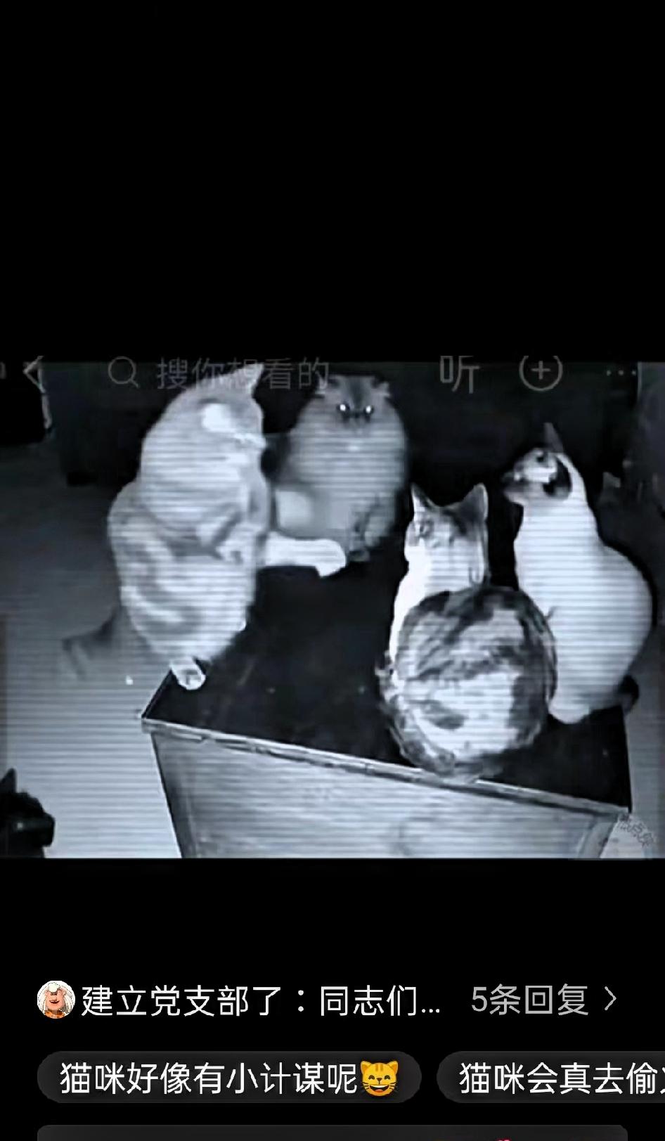一位网友在家里的监控中,无意中拍到的一组离奇画面,四只流浪猫猫咪围坐一团 一只当“领头猫”,爪子不停比划着方向,脑袋还左右转动,嘴里时不时发出短促的喵呜声,像是在强调重点,另外三只则乖乖坐好,耳朵竖得笔直,眼神专注又认真,连尾巴都紧紧贴在身体两侧,活脱脱一副“听领导部署任务”的模样,生怕错过半点关键信息。 网友脑补的“超市火腿肠攻略”简直神还原!大概率是中间那只猫在分享独家觅食秘籍:“兄弟们,街对面超市货架第二排,藏着超多火腿肠!我天天趁人少的时候去叼,回来喂我家小宝宝,从没失手过!你们想去就记着,动作要快、下手要轻,千万别被店员发现,不然下次就没机会了!” 这场景越看越上头,原来猫咪根本不是我们印象中“高冷独行侠”,它们的社交能力和沟通默契,远比想象中厉害。 平时总觉得流浪猫各自为战、互不打扰,可这画面狠狠打破了偏见——它们也有自己的“小团体”,会抱团取暖,更会分享生存技巧。那些我们听不懂的叫声、看不懂的肢体动作,都是它们的“交流暗语”,藏着对同伴的信任,也藏着在艰难环境中互相扶持的温暖。 其实动物的世界,藏着太多不为人知的温柔与智慧。它们没有复杂的算计,却懂得“资源共享、互帮互助”,这份纯粹的默契和情谊,反而让人觉得格外治愈。比起人类世界的勾心斗角,猫咪们简单直接的相处模式,反而更显珍贵。 你家毛孩子有没有过让你惊掉下巴的“社交名场面”?
