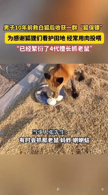“万物皆有灵!”23日报道,黑龙江,一男子在10年前救了一只白狐,没想到之后白狐就不肯走了,甚至还生下了4代小狐狸,世代帮他看守稻田,地里再也没有出现老鼠,这些狐狸俨然成为了他的“保镖”!网友:这狐狸上辈子和他一定有缘啊。 十年前的一个秋日,黑龙江五常市的农民张先生在自家稻田边发现了两只受伤的白狐,看着它们虚弱的模样,他心生怜悯,带回家精心照料了一个多月,伤愈后他将狐狸放归田野,以为这段缘分就此结束。 没想到这对白狐并未走远,反而在稻田附近安了家。更让张先生意外的是,它们开始主动在田间捕食老鼠,原本每年因鼠害损失不少稻谷的他,渐渐发现田里的老鼠越来越少,庄稼长势也比往年好了许多。 为了感谢这两位“不请自来”的帮手,张先生开始定期给它们准备食物,从最初的剩饭剩菜,到后来专门采购的鸡胸肉、鱼肉,他把这些狐狸当成了自家的一份子,狐狸们似乎也懂得这份情意,每次张先生走进田地,领头的那只总会跑到他跟前转悠几圈,有时还会轻轻咬住他的裤脚。 随着时间推移,狐狸家族逐渐壮大,从最初的两只繁衍到现在的二十多只,已经传到第四代了,这些大大小小的白狐分工明确,白天在田边休息,傍晚和夜间出动捕食。除了老鼠,蚂蚱、蝲蝲蛄等害虫也都成了它们的猎物。 张先生粗略算过,自从有了这群狐狸,每年因虫害造成的损失减少了近三成,这可是实实在在的收益,更难得的是狐狸们从不破坏庄稼,活动范围主要在田埂和地头,几乎成了天然的生物防治队。 如今给狐狸们准备食物已经成了张先生的日常,每周他都要准备一大盆肉类和其他食物,从鸡肉、鱼肉到煮熟的鸡蛋,有时还会买些新鲜螃蟹改善伙食,若是哪天他忘了按时送饭,狐狸们还会跑到家门口转悠,仿佛在提醒他该“开饭”了。 这段奇特的经历被张先生分享到社交平台后,吸引了77万粉丝关注,很多人感慨,原来人与野生动物之间真的可以建立这样的信任关系,也有网友开玩笑说,这些狐狸的伙食标准都赶上城里人了。 “这哪儿是狐狸啊,分明是来自大自然的‘报恩天团’! 十年前的一个善举,换来四代狐狸的守护,这剧情连编剧都不敢这么写。老爷子心善,狐狸也有灵性,这才是真正的双向奔赴!” “建议申报‘生物防治最佳实践奖’! 狐狸抓老鼠比农药环保多了,既护了稻田,又维护生态平衡。张先生这是无意中搞成了可持续农业的典范啊,值得推广!” “哈哈哈,看看狐狸的伙食标准:鸡胸肉、包子、鸡蛋,甚至还有螃蟹! 难怪拖家带口来上班,这待遇谁不迷糊?建议狐狸家族内部开个会,评个‘最佳雇主’给张先生颁个奖!” “小时候听奶奶讲狐仙报恩的故事,总觉得是神话,没想到现实中真有原型! 万物真有灵性,你善待生命,生命也会用它的方式守护你。这故事我能讲给我家孩子听!” “这狐狸怕不是上辈子救了银河系,这辈子才遇到这么好心的大叔? 十年投喂,风雨无阻,这份坚持太难得了,希望人类和野生动物之间能有更多这样的温暖故事!” “有没有可能狐狸之间有个‘打工群’? 领头的白狐在群里发消息:‘五常市稻田区招长期保安,包吃包住,家族企业,稳定发展!’ 不然怎么解释队伍越来越壮大?” “对比那些破坏生态、滥捕野生动物的人,张先生的故事简直是一股清流。 保护动物其实就是在保护我们自己的生存环境,希望更多人能被这份善意感动!” 如果你在田间遇到一只受伤的野生动物,你会怎么做?你觉得人类与动物共存的最高境界是什么样的? 快来评论区分享你的看法吧! 信源:新华社