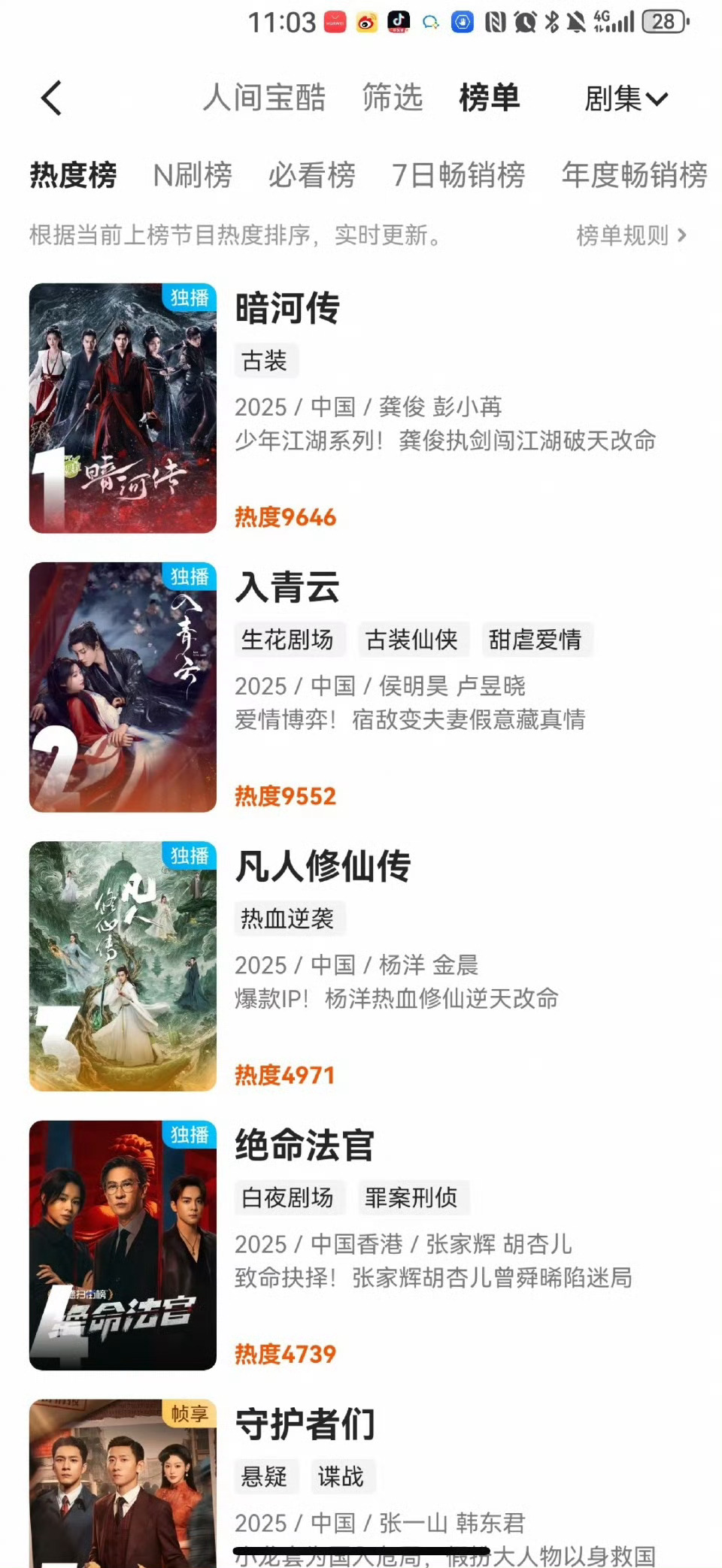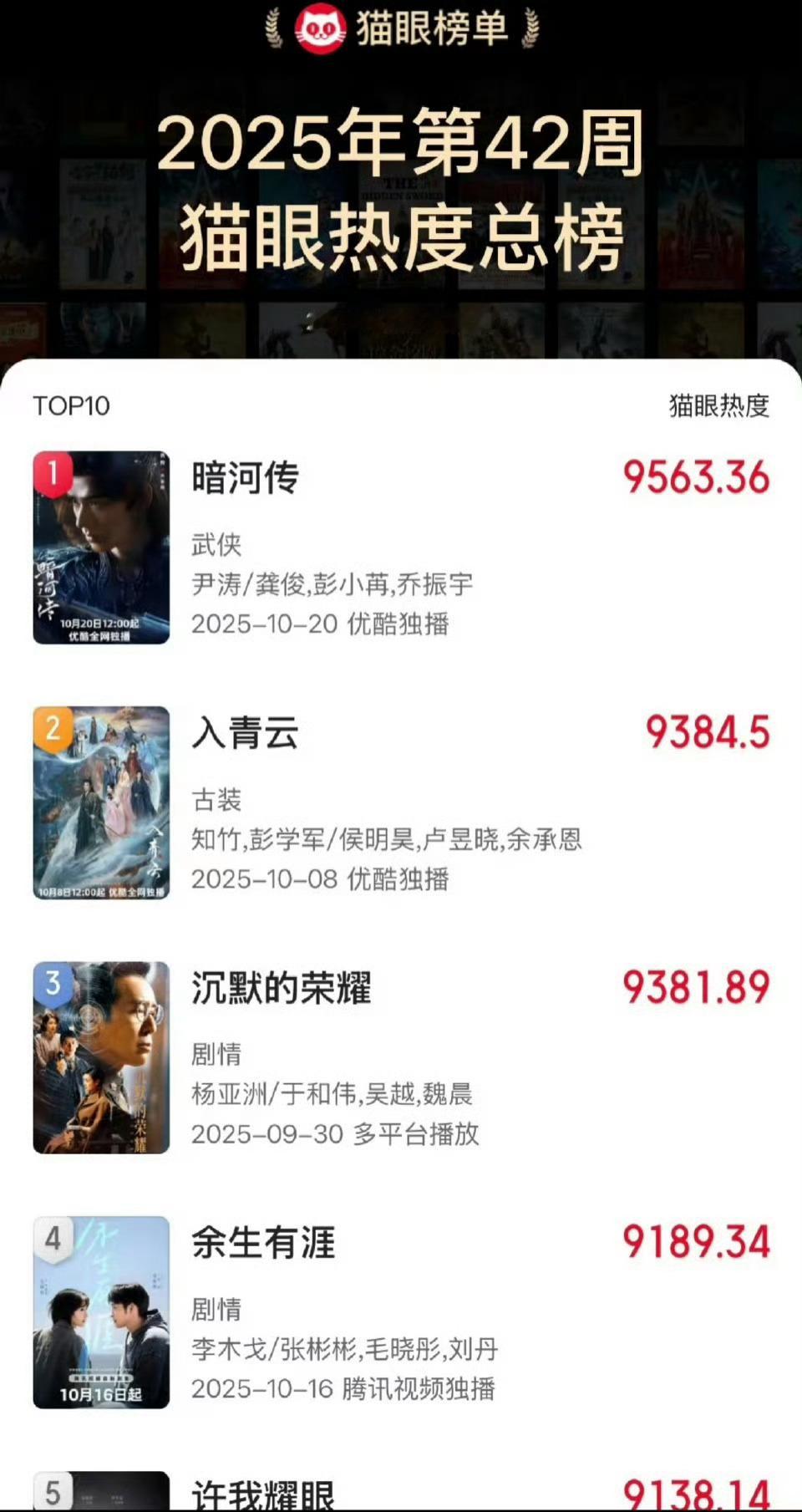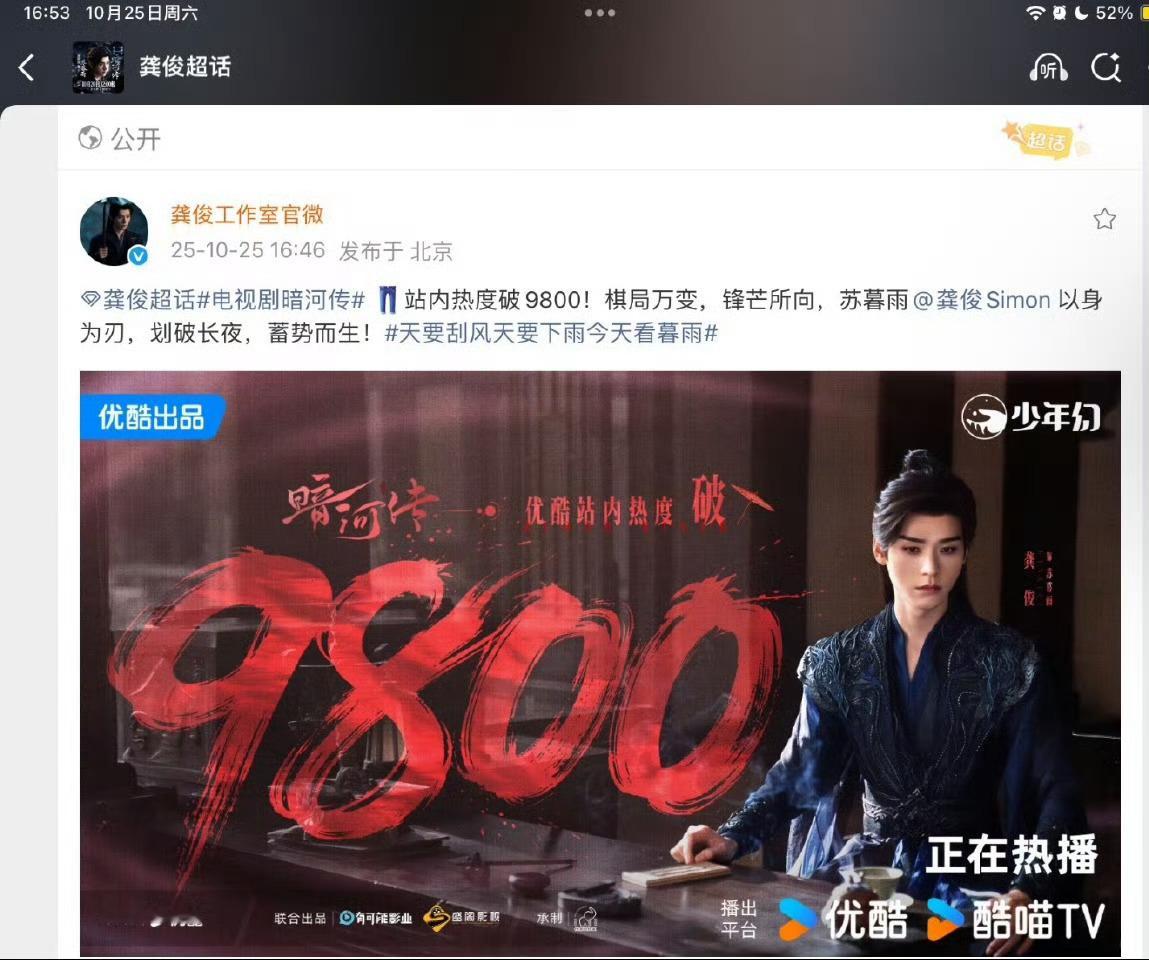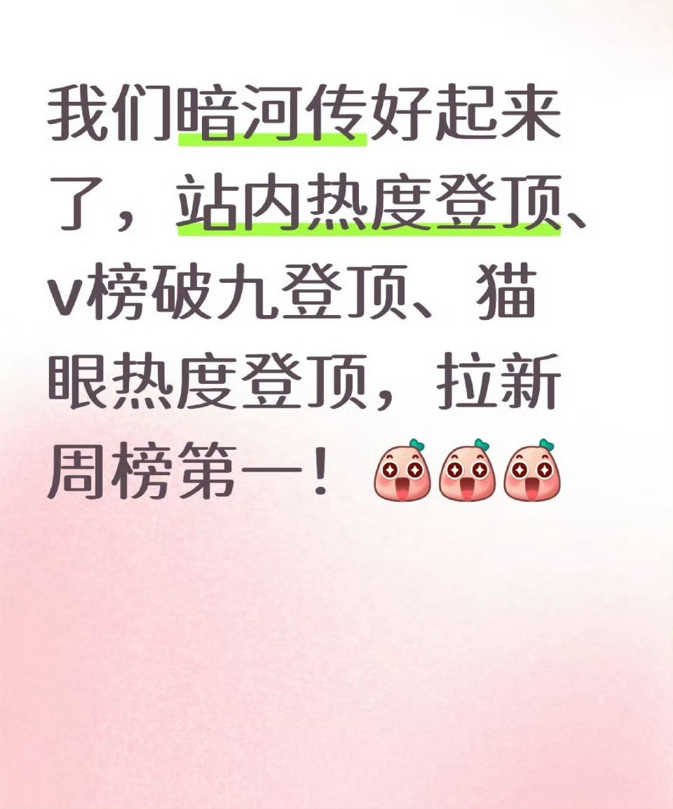 好起来了,我们《暗河传》尊嘟好起来了,站内热度已破9800,v榜破九登顶、猫眼热度登顶,拉新周榜第一,观众持续入场[爱慕][爱慕]
