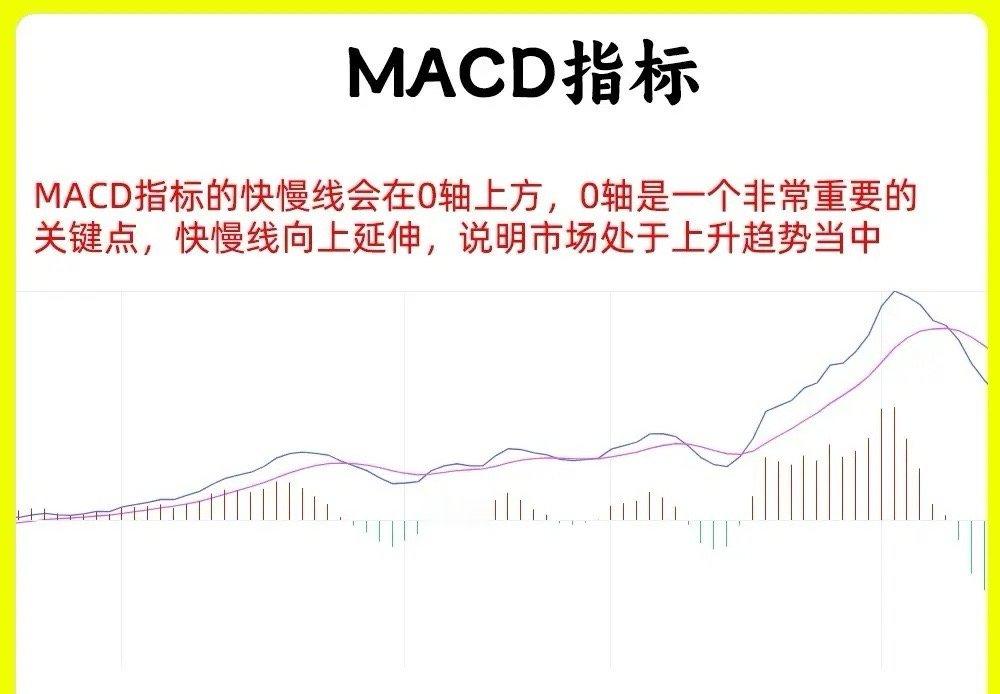 强势股走出行情的时候,MACD指标的快慢线会在0轴上方,0轴是一个非常重要的关键点,快慢线向上延伸,说明市场处于上升趋势当中