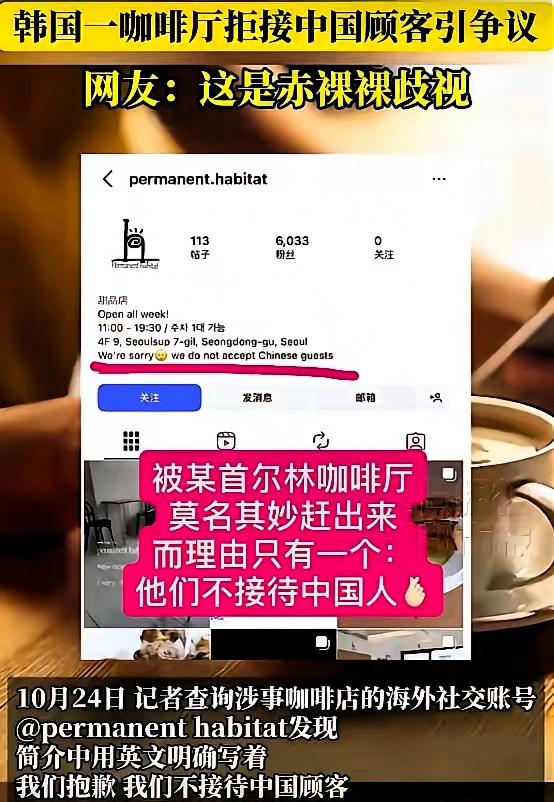 “丢人现眼!”韩国这咖啡店简直狂得没边了!靠中国博主打卡火起来,转头就把点了单的中国顾客赶走,还敢明着写“不接待中国人”。 面对质疑,老板居然说“这就是我”,摆明了搞国籍歧视。做生意最忌忘恩负义,放着送上门的生意不做,纯属自断后路。你觉得这种店该被彻底避雷吗?