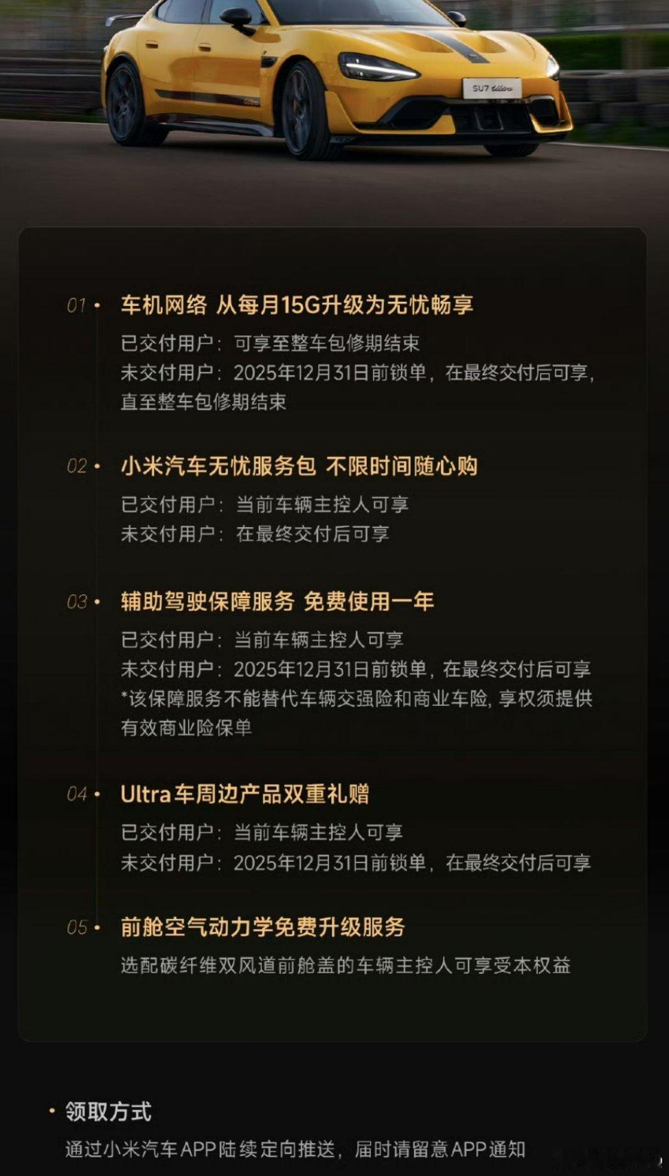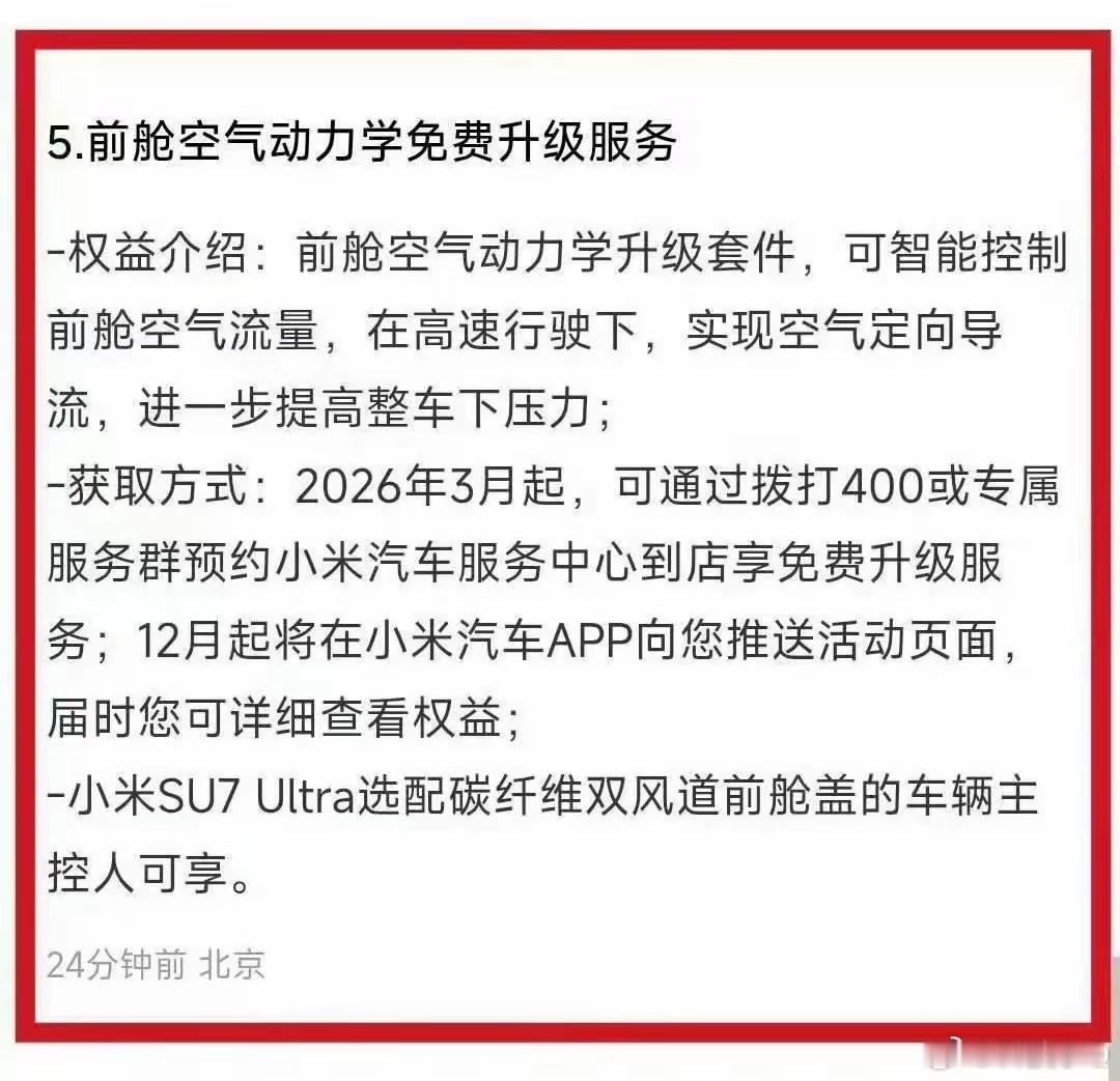 2026年3月起,可通过拨打400或专属服务群预约小米汽车服务中心到店享免费升级服务!!