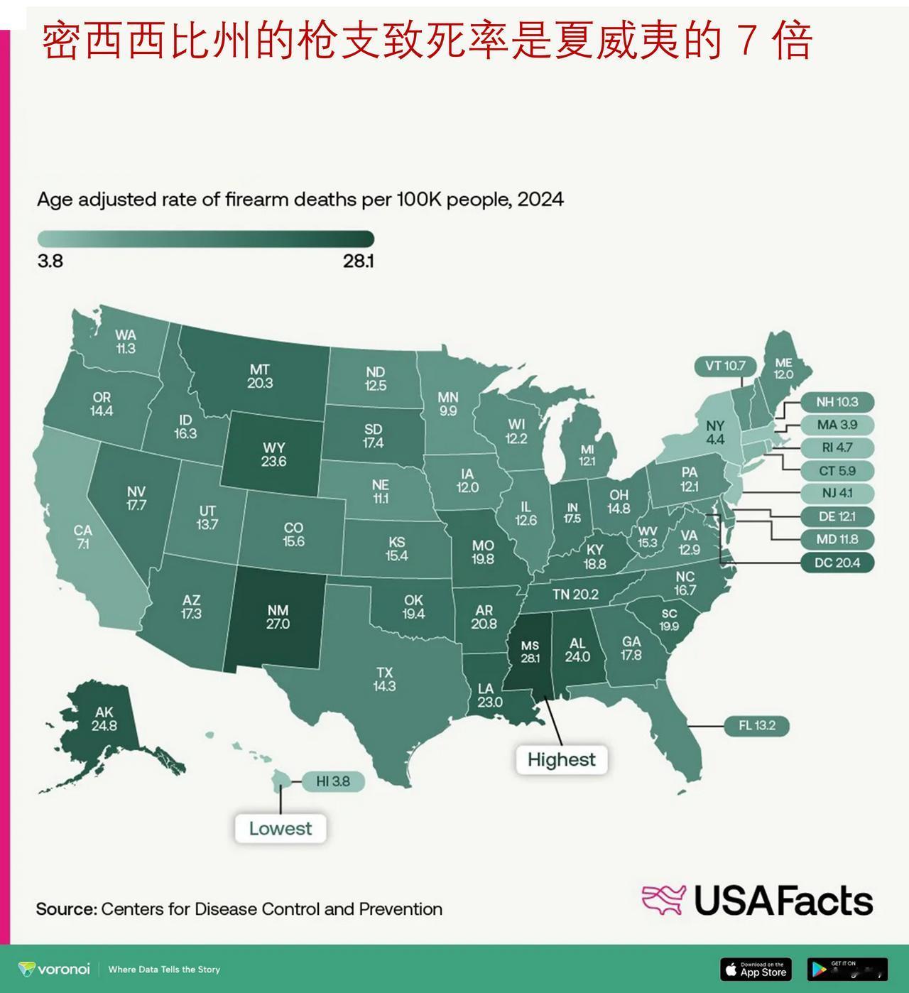 美国哪里与枪支相关死亡率高?导致各州与枪支相关死亡率差异的原因是什么? 枪支暴力仍是美国最为严峻的公共健康问题之一。尽管全国性的讨论往往聚焦于联邦政策,但实际情况在各州之间却有着极大的差异。 上面这张地图是由“USAFacts”组织利用疾病控制与预防中心(CDC)的数据制作而成的。它展示了 2024 年美国各州每 10 万居民中因枪支导致的死亡人数。 一目望去,我们可以看到范围十分广泛——从夏威夷每 10 万人仅有 3.8 例死亡,到密西西比州每 10 万人超过 28 例死亡。 ——美国枪支致死事件:一场全国性的危机,各地情况各异 与其他高收入国家相比,美国的枪支致死率极高。然而,若将不同州进行比较,这种差距则显得更为显著。像密西西比州、路易斯安那州和阿拉巴马州这样的南部州在枪支致死率方面位居全美之首,其死亡率往往是东北部州(如马萨诸塞州、新泽西州和纽约州)的两倍甚至三倍。 ——各州之间差异的原因是什么? 造成这些地域差异的原因较为复杂,但总体上可归结为三个关键因素: 1)枪支管理法规:实行更严格枪支管控的州,其枪支致死率通常更低。例如,夏威夷和马萨诸塞州在枪支管控方面规定最为严格,且其死亡率也最低。 2)枪支拥有情况:无论是在凶杀案还是自杀事件中,枪支拥有率越高,导致的与枪支相关的死亡人数就越多。 3)社会经济状况:贫困、难以获得心理健康服务以及社会不稳定等因素共同导致了枪支暴力事件的高发率。 ——文化与历史的作用 在美国的许多地区,尤其是在南部和西部山区,枪支已深深融入当地的文化之中。狩猎、自卫以及对第二修正案权利的坚定支持,这些因素影响着政策决策和公众情绪,使得任何针对全州范围的枪支管制措施在政治上都颇具挑战性。 与此同时,死亡率较低的州的城区仍会出现局部的枪支暴力事件激增的情况,这通常是由诸如黑帮活动等因素引起的。这凸显出州级的平均数据可能掩盖了各州内部的重要差异。