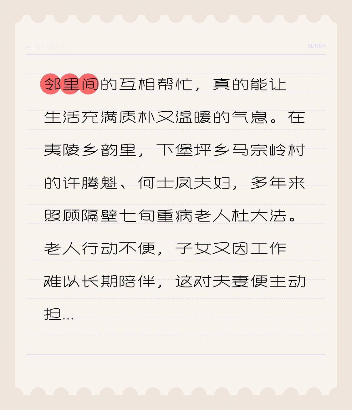 邻里间的互相帮忙,真的能让生活充满质朴又温暖的气息。在夷陵乡韵里,下堡坪乡马宗岭村的许腾魁、何士凤夫妇,多年来照顾隔壁七旬重病老人杜大法。老人行动不便,子女又因工作难以长期陪伴,这对夫妻便主动担起“儿女”之责。 还有怀远县魏庄镇方坝村的包秀珍,八年来悉心照顾双目失明的邻居邝吉菊。每天跑三四趟,帮着做饭、买菜。哪怕岁月流转,她从未间断。远亲不如近邻,这样的邻里真情,就是生活中最动人的风景。 乡村邻里关系
