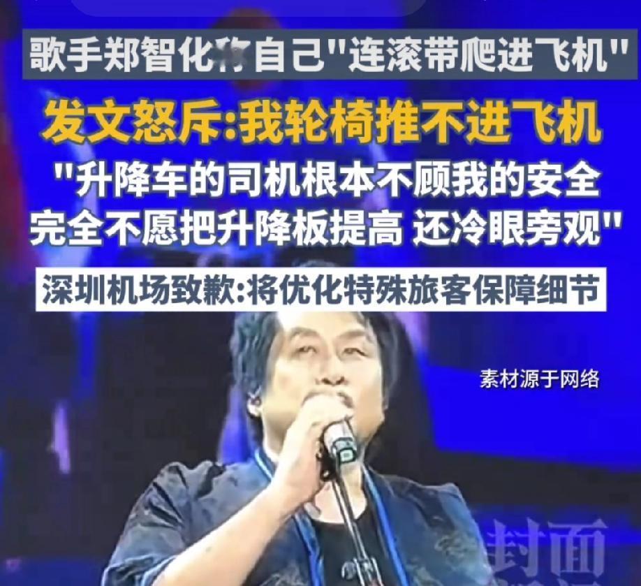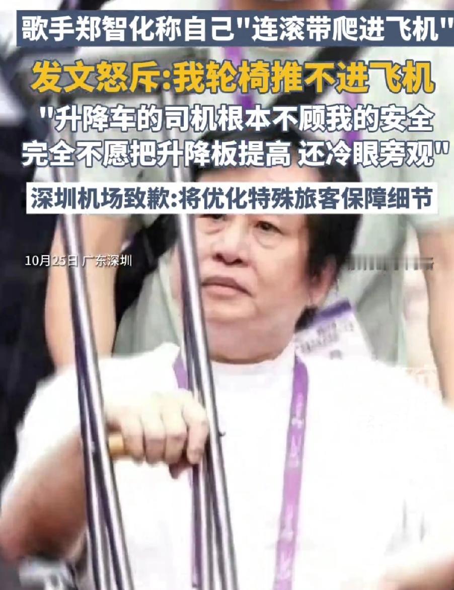 无障碍设施不能只建不用,关键在服务意识。 设施是死的,人是活的。再好的设备,如果工作人员缺乏同理心,残疾人出行照样困难重重。 10月25日,歌手郑智化在微博发了一段经历,引发全网关注。 他在深圳机场坐飞机时,遇到了糟心事。 飞机停在远机位,需要坐升降车登机。但升降车和机舱门之间,竟有25公分高度差。 他是轮椅使用者,童年因小儿麻痹症行动不便。 这25公分,对普通人可能只是一步,对他却像一道鸿沟。 轮椅推不进去,腿也迈不开。 更让他心寒的是操作升降车的司机。 郑智化说,司机完全不愿调整升降板,就冷眼看着他连滚带爬钻进飞机。 他最后说:“我已经算有涵养的人,但对这种没人性的行为,忍无可忍!” 事件曝光后,深圳机场迅速回应。 他们在郑智化微博下道歉,说已关注情况,并会同航空公司启动核查。 机场还承诺,会全面审视和优化特殊旅客的服务保障细节。 郑智化的遭遇,暴露了公共服务中的一个普遍问题: · 硬件差距:25公分看似小事,却暴露无障碍设施设计或执行不到位。 · 态度差距:司机冷眼旁观,反映部分服务人员缺乏对特殊人群的同理心。 这件事能上热搜,说明社会对弱势群体的权益越来越关注。 深圳机场回应快是好事,但真正的改善,要靠后续行动。 希望所有公共服务都能以此为契机,做到设施与人心都“无障碍”。 毕竟,文明的尺度,恰恰体现在它对弱势群体的态度上。