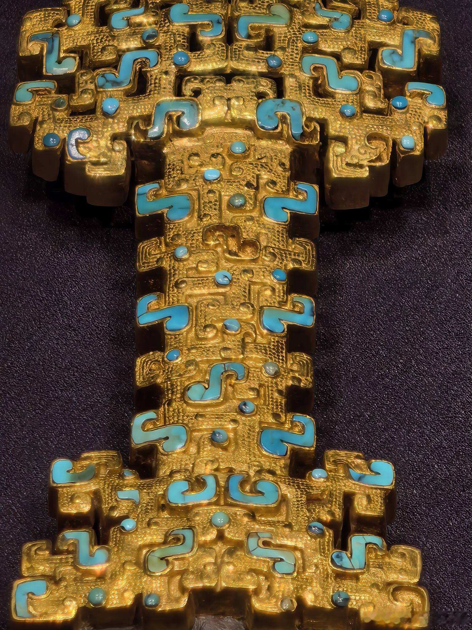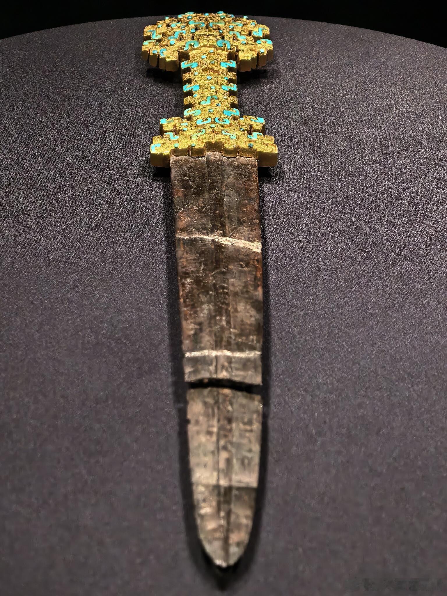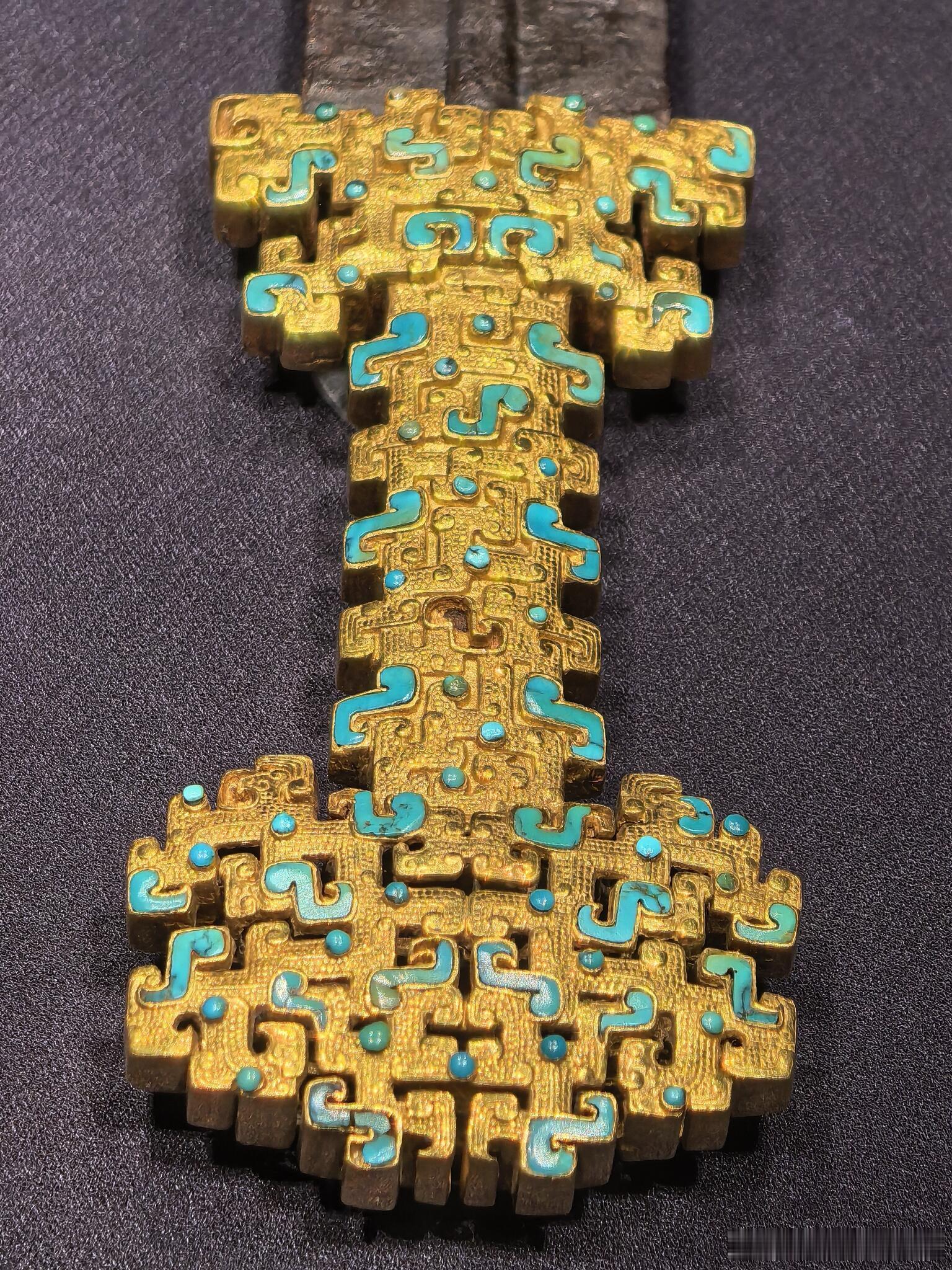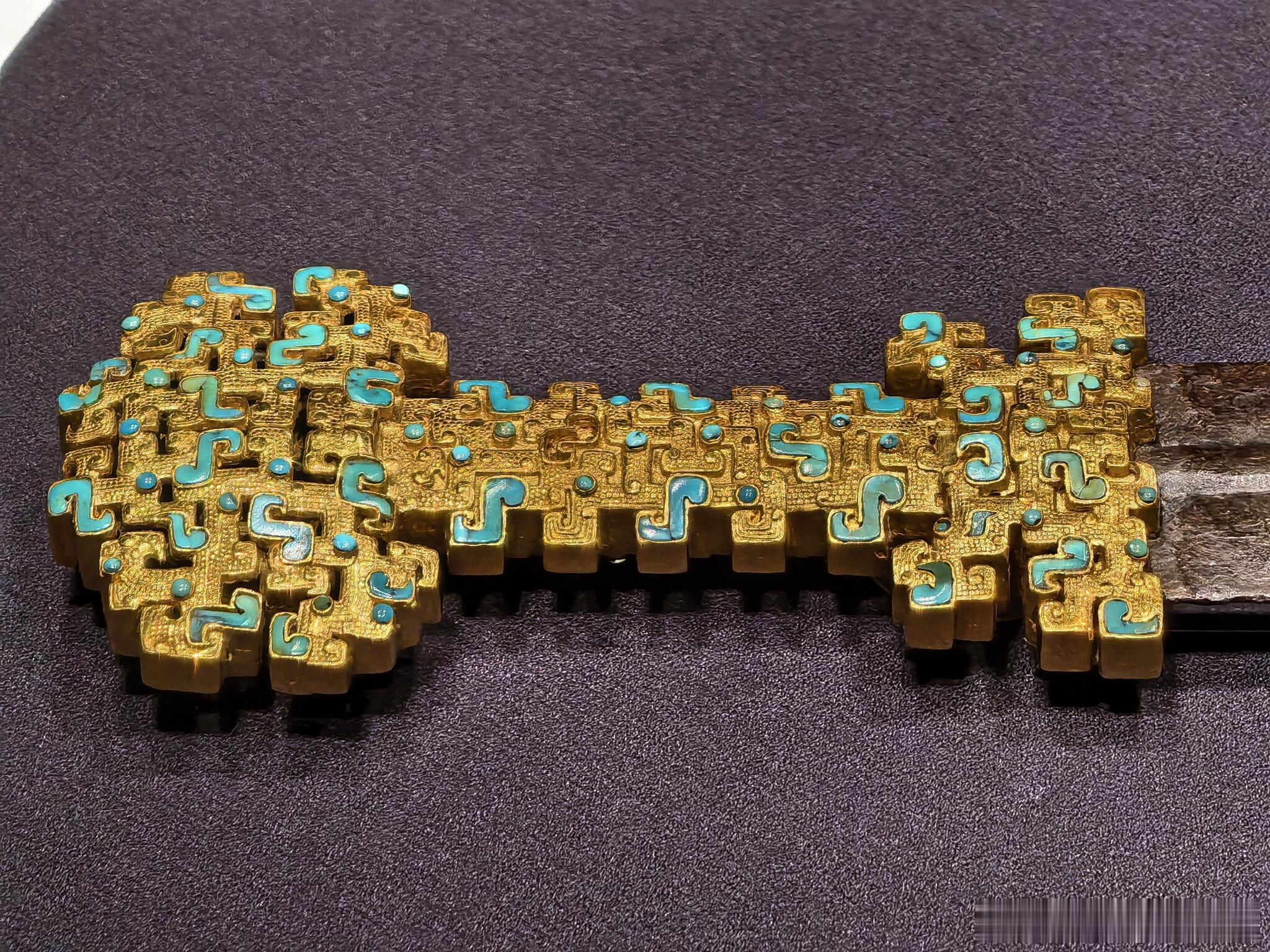 这把剑的金柄堪称“黄金艺术秀”:镂空设计的蟠虺纹相互交错,还镶嵌着绿松石,在战国时期绝对是“顶级奢侈品”。更牛的是它的工艺——金柄和铁剑是分别浇铸后用铆钉接合的,要知道黄金和铁的熔点差很大,能做出这种“金铁合体”,说明当时秦人的金属工艺已经超神了🔨!