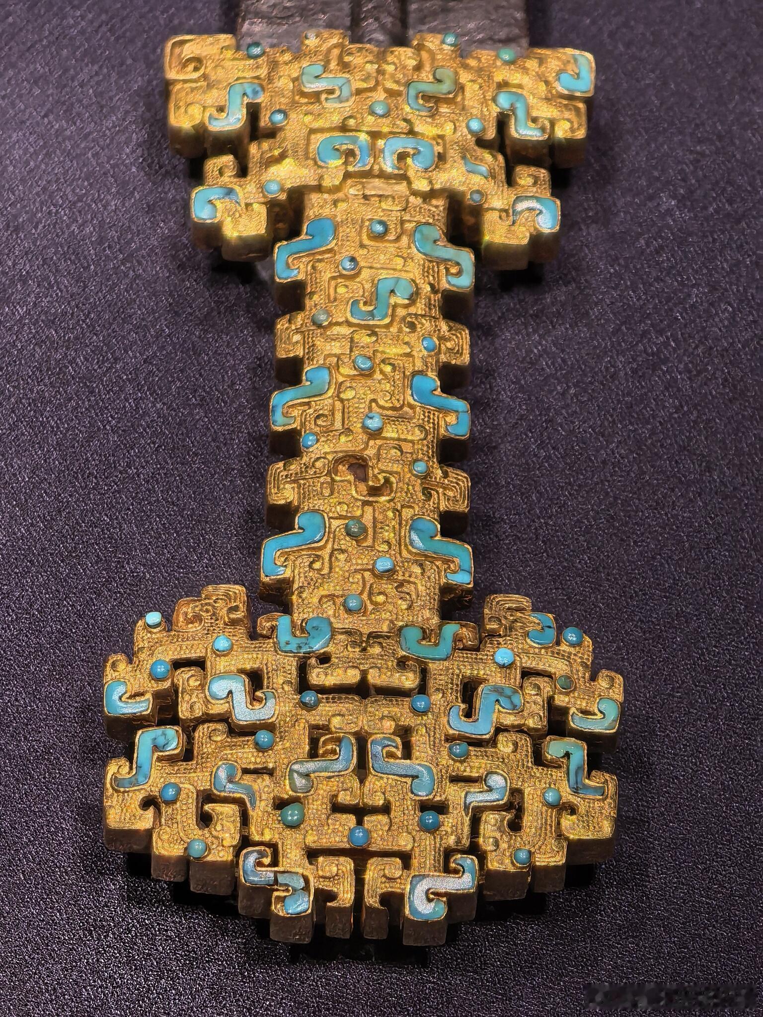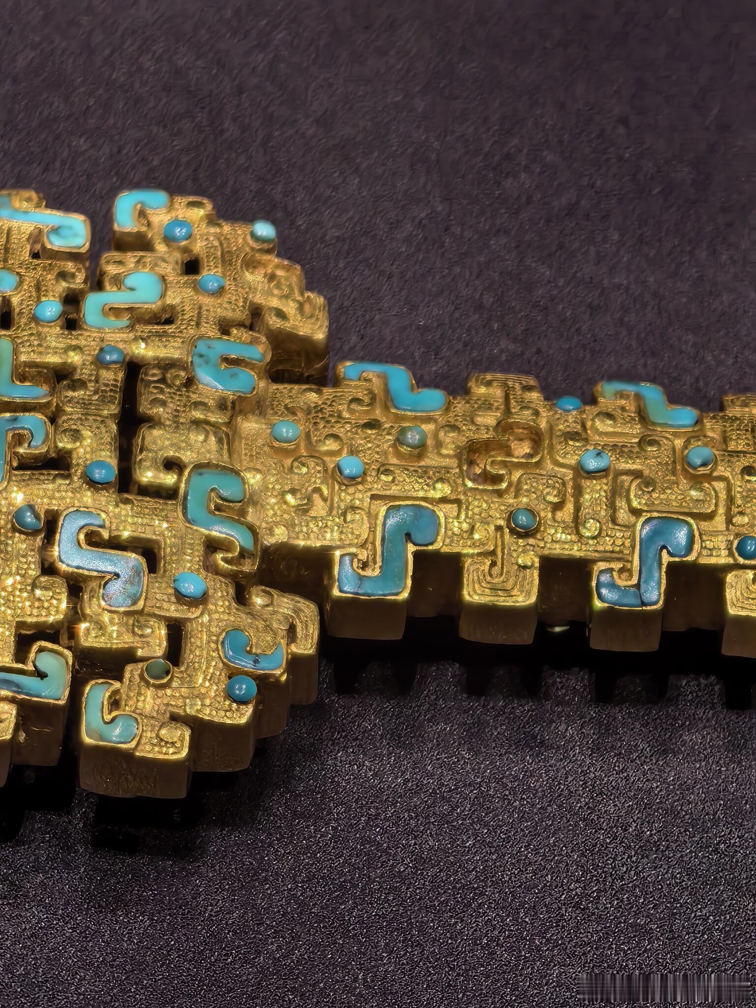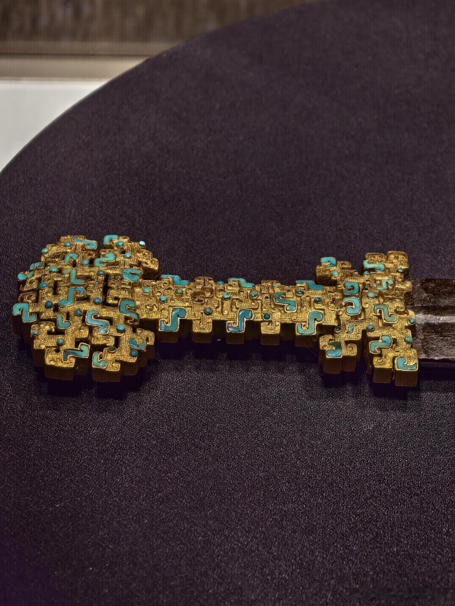 这把剑的金柄堪称“黄金艺术秀”:镂空设计的蟠虺纹相互交错,还镶嵌着绿松石,在战国时期绝对是“顶级奢侈品”。更牛的是它的工艺——金柄和铁剑是分别浇铸后用铆钉接合的,要知道黄金和铁的熔点差很大,能做出这种“金铁合体”,说明当时秦人的金属工艺已经超神了🔨!