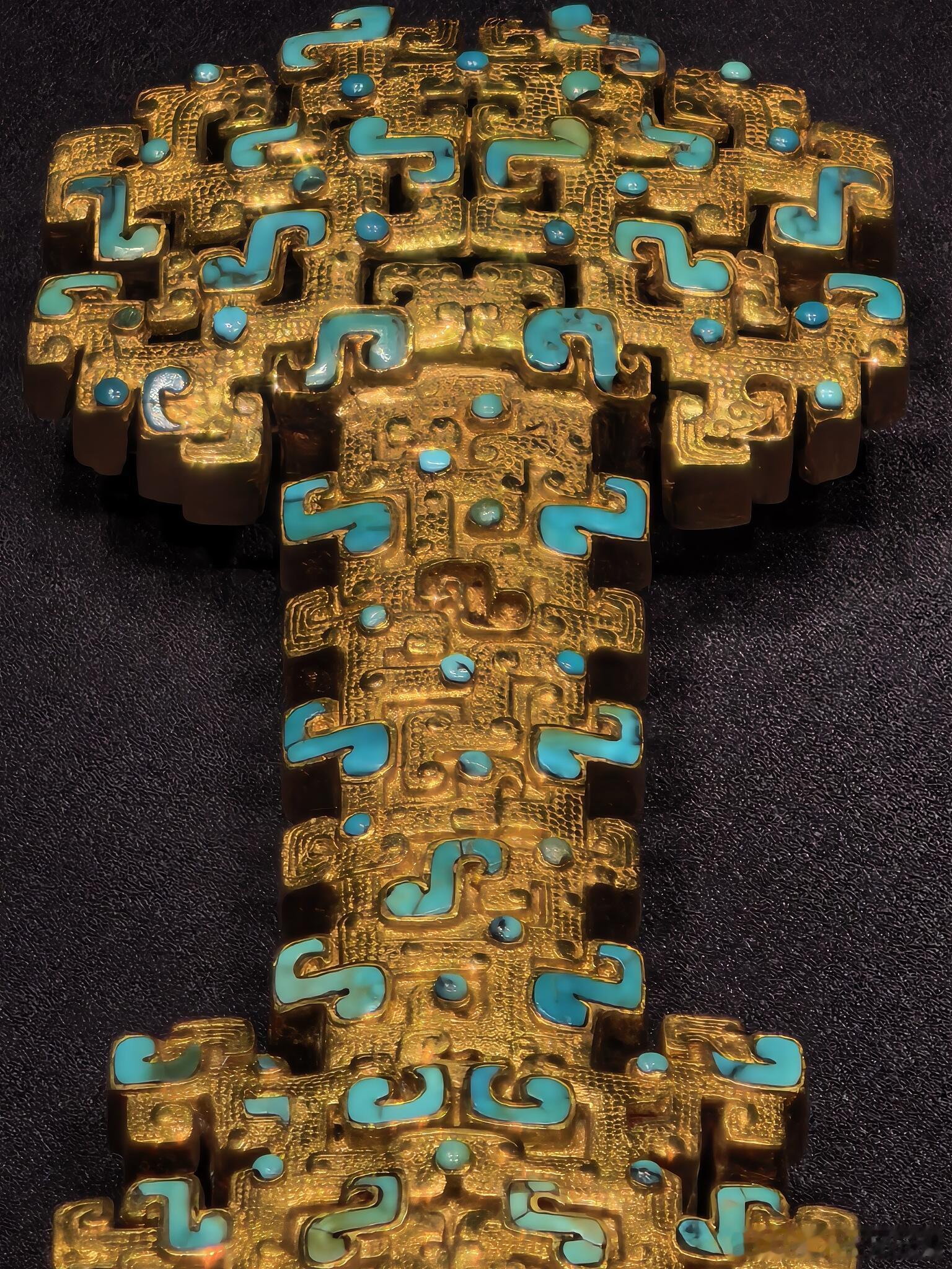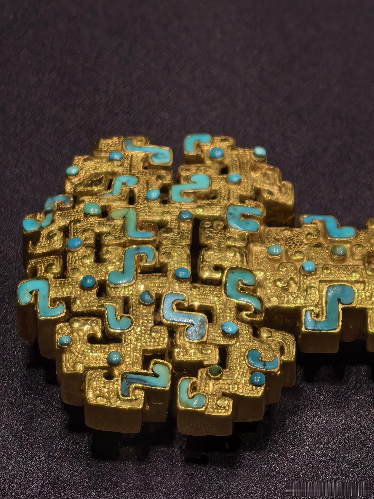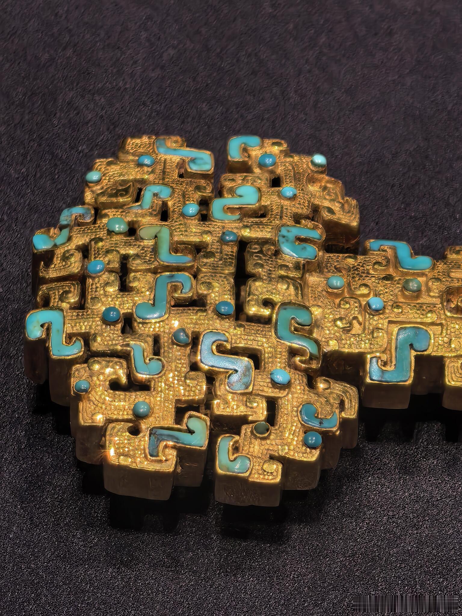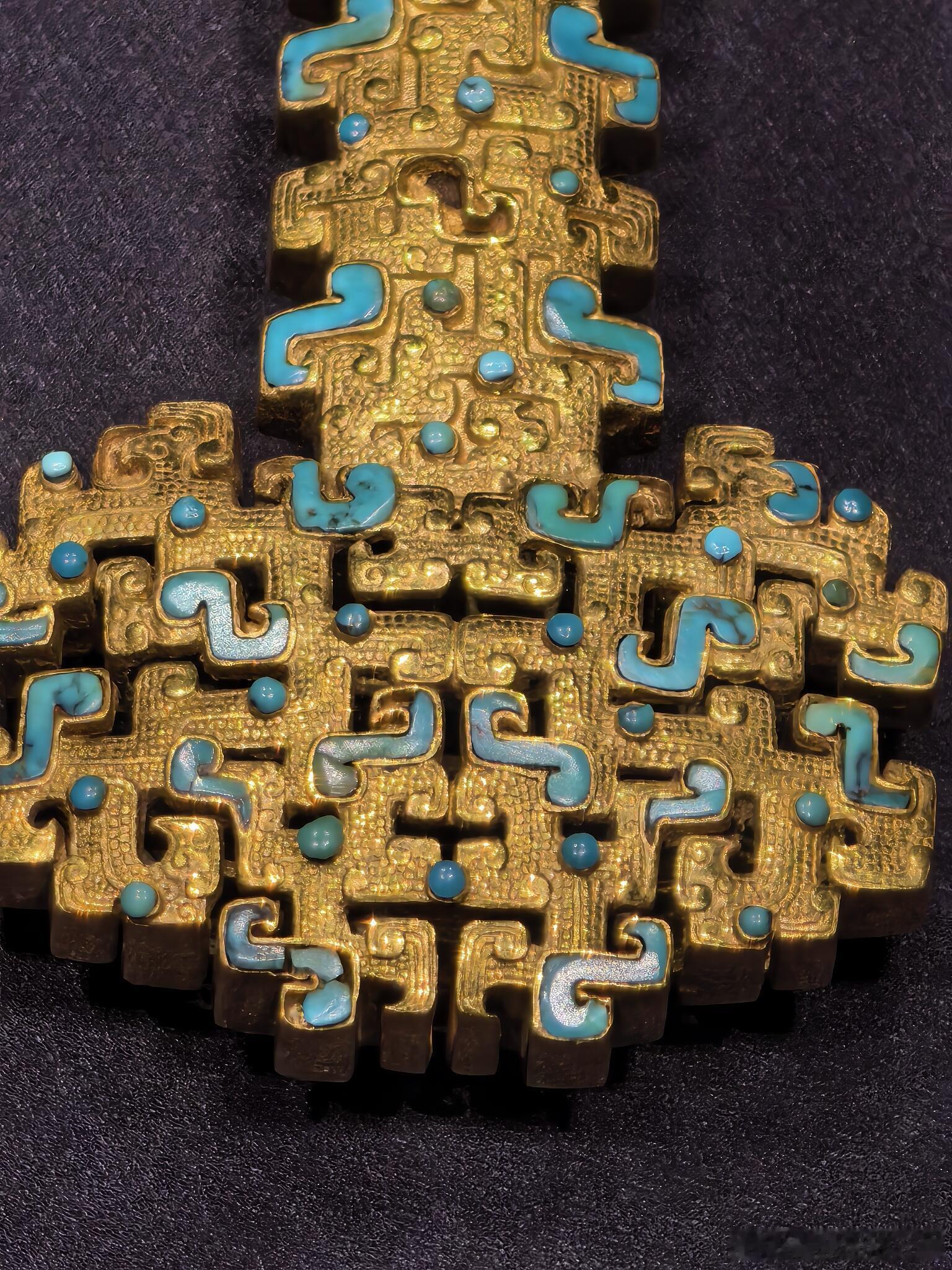 这把剑的金柄堪称“黄金艺术秀”:镂空设计的蟠虺纹相互交错,还镶嵌着绿松石,在战国时期绝对是“顶级奢侈品”。更牛的是它的工艺——金柄和铁剑是分别浇铸后用铆钉接合的,要知道黄金和铁的熔点差很大,能做出这种“金铁合体”,说明当时秦人的金属工艺已经超神了🔨!