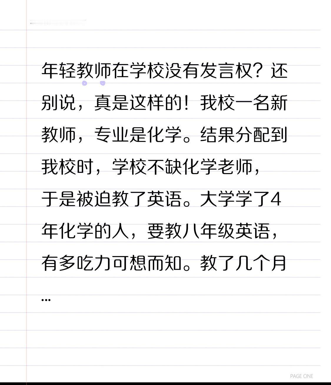 年轻教师在学校没有发言权? 还别说,真是这样的! 我校一名新教师,专业是化学。 结果分配到我校时,学校不缺化学老师,于是被迫教了英语。 大学学了4年化学的人,要教八年级英语,有多吃力可想而知。 教了几个月英语,原来的英语老师休完产假回来了,这位年轻教师就又改行教七年级语文。 笔者自己年轻时也曾像这位新教师一样,不能教自己的专业学科,只能服从领导安排,今年教物理,明年教语文的。 我觉得,学校领导应该站在学生的角度考虑问题,不让年轻教师教自己的专业学科,他们又什么经验都没有,怎么能教出好成绩呢? 笔者想给学校领导们提个醒,别折腾年轻教师了,这不仅是为他们负责,更是为学生负责,为学校负责啊! 大家认为是不是这个道理?