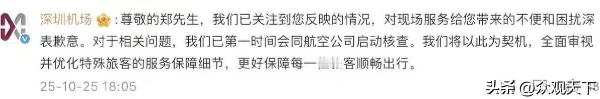 25cm高差致郑智化“连滚带爬”登机,深圳机场快速回复能否解残障服务痛点,服务短板能否补齐? 郑智化因为在深圳机场搭乘飞机遇到轮椅无法顺利通过机门的问题,投诉说:“人能不能有一点儿心。”深圳机场14:59发出投诉,18:05就回复了,速度非常之快。回复也很诚恳,表示歉意并承诺以后会改进。 按机场的说法,残障人士的轮椅与升降机之间,有25cm的高差,不能顺利通过。机门也比较窄,郑智化只能“连滚带爬”进了飞机。说实在的,这种情况确实不应该发生在任何一个残障人士身上。 我们都能理解,机场的设备与服务,是很难面面俱到的,可是至少应该知道残障人士的轮椅与升降机之间,有25cm的高差啊。应该想办法把残障人士扶上飞机,而不是让他“连滚带爬”地上飞机。 深圳机场下属单位这么快这么诚恳地回复,真令人佩服。如果深圳机场能以此为鉴,今后加强对残障人士的服务,那就更好了。