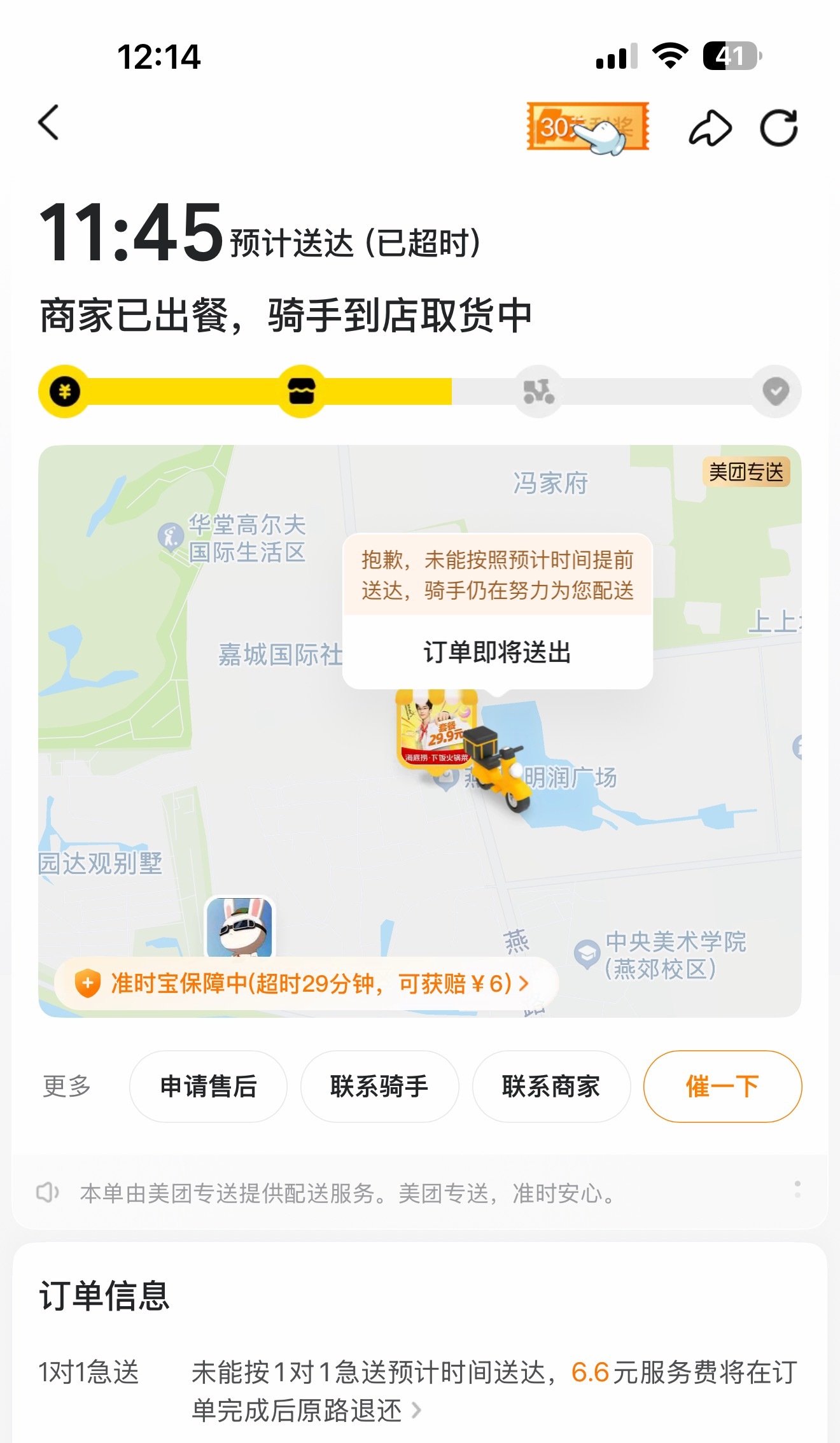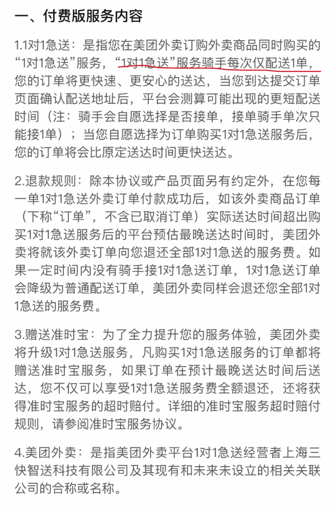 最离谱的是,我还花钱选了个“1对1急送”,我理解的不应该是在这段时间只送我这个订单吗?(如图4)别告诉我“1对1急送”是你们美团的配送目标。[嘻嘻]