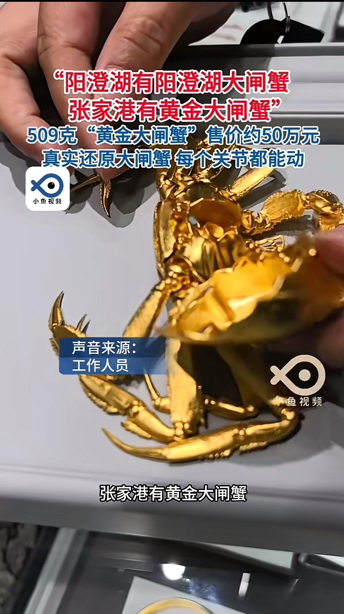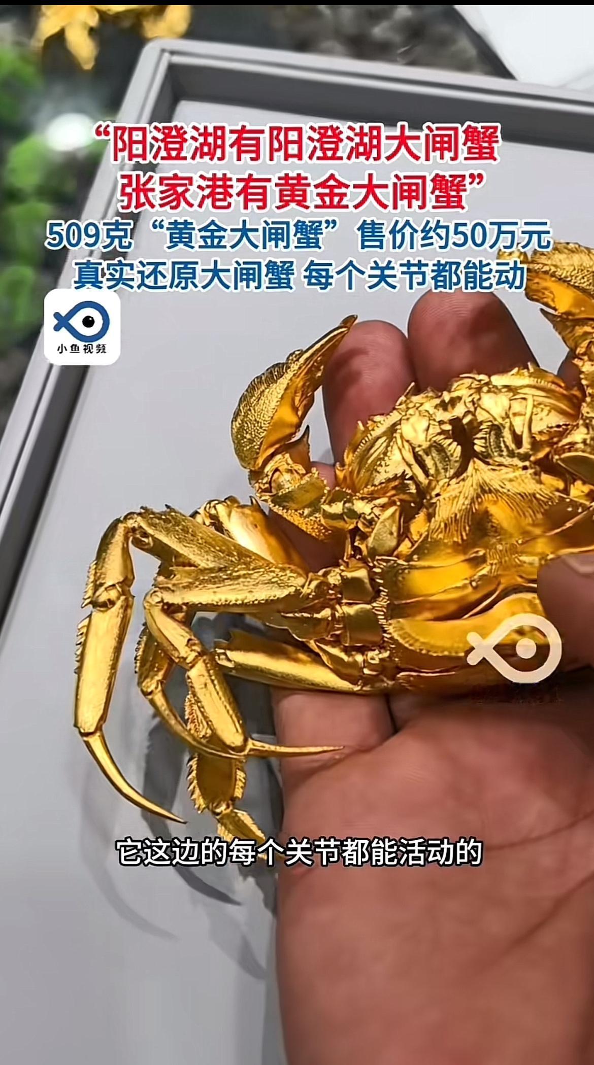 50万的黄金大闸蟹,每个关节还都能动,这简直是大闸蟹界的“超级王者”!平时咱在京东买的阳澄湖大闸蟹,去绳足重2.3 - 3.6两的,也就装在礼盒里当生鲜卖。可这50万的黄金大闸蟹,身价不知高了多少倍。 再看看京东拍卖的宿迁“蟹王蟹后”,公蟹1斤/只、母蟹7两/只,平均50万只里才出一只,蟹脚能有手臂长。但和这50万的黄金大闸蟹比,估计还是小巫见大巫。这黄金大闸蟹到底啥样,谁舍得吃啊,感觉更适合当艺术品收藏!