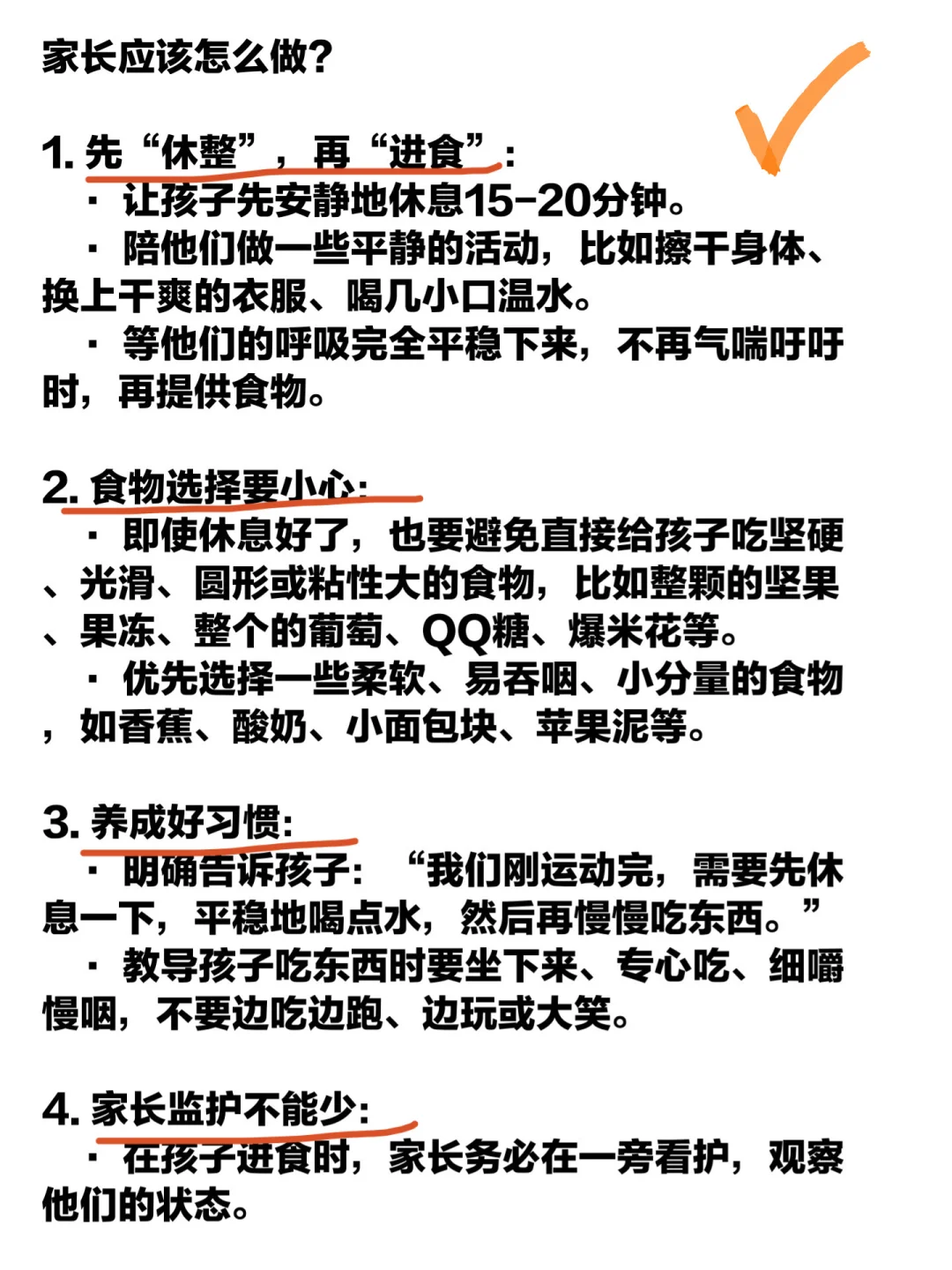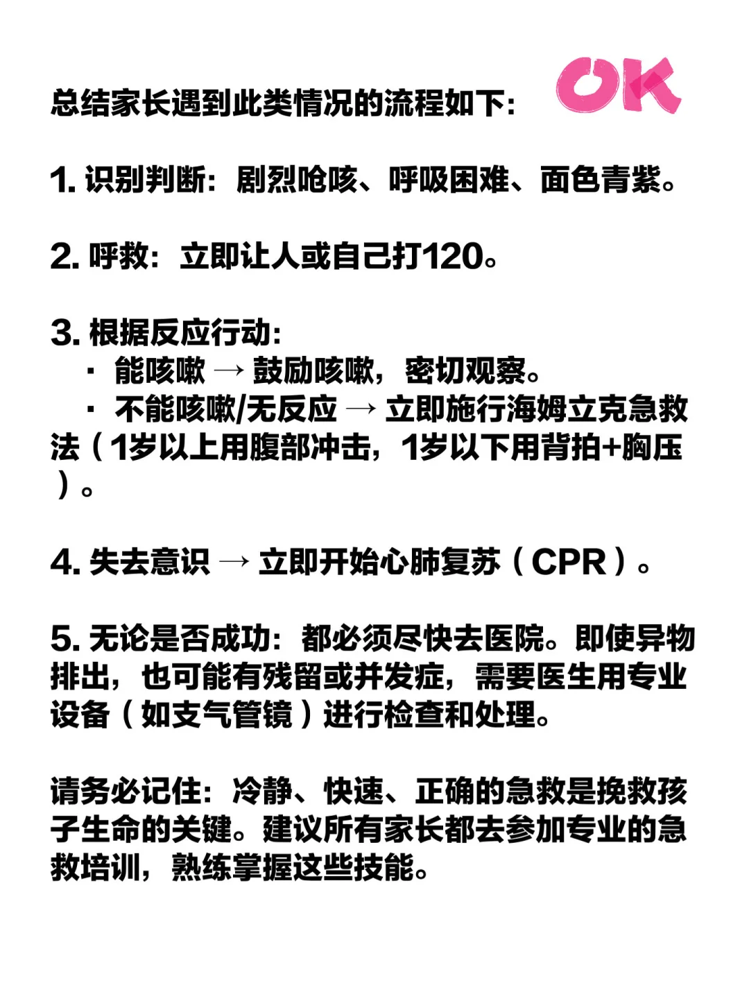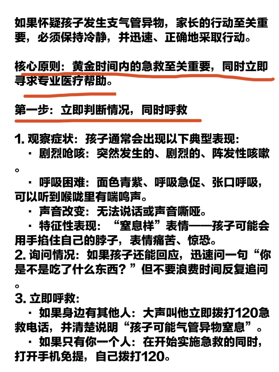 1. 避免给5岁以下儿童食用坚果、果冻等高风险食物。 2. 将小物件放在儿童接触不到的地方。 3. 教育孩子不要将非食物物品放入口中。 4. 孩子进食时要保持安静,避免哭闹、大笑或奔跑。 5. 选择适龄玩具,定期检查是否有小零件松动。建议家长都学会海姆立克急救法 若怀疑孩子发生支气管异物时,家长要保持冷静,可立即采取以下措施: 1.1岁以下婴儿:采用背部拍击法:将婴儿面朝下放在前臂上,头部低于胸部,用手掌根部快速拍击肩胛骨之间的区域5次。 如果无效,改用胸部冲击法:将婴儿翻转,面朝上,用两指快速按压胸骨下半段5次。 2. 1岁以上孩子:站在孩子身后,双手环抱其腰部,一手握拳,拇指侧放在肚脐上方,另一手抓住拳头,快速向内上方冲击。 在进行急救的同时,要立即拨打急救电话。即使异物排出,也要送医检查,因为可能仍有残留或损伤。
