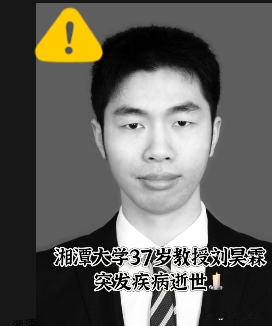  震惊! 又一年轻教师陨落在三尺讲台! 37岁的刘昊霖教授,昨天不幸去世! 又是一个才华横溢的年轻教师, 为什么命这么脆弱! 为什么身体不能强壮一些! 为什么不能好好爱惜自己,多为自己考虑一些! 刘教授2006年考入四川大学计算机专业,2015年获得工学博士学位,同年进入湘潭大学计算机学院任教, 主要研究方向为物联网技术与应用、边缘计算与服务、优化算法等, 主持过多项国家级、省部级科研项目,并在国际国内重要学术期刊和会议上发表学术论文多篇。 今年带领研究生完成《基于深度学习的网络流量异常检测方法研究》项目。 教师是人类灵魂的工程师,是伟大的职业,今年以来,不幸去世的中青年大学教师已超过30位! 这个数据让人心痛,也让人深思,生命无常,身体健康的重要性不言而喻! 博导离世