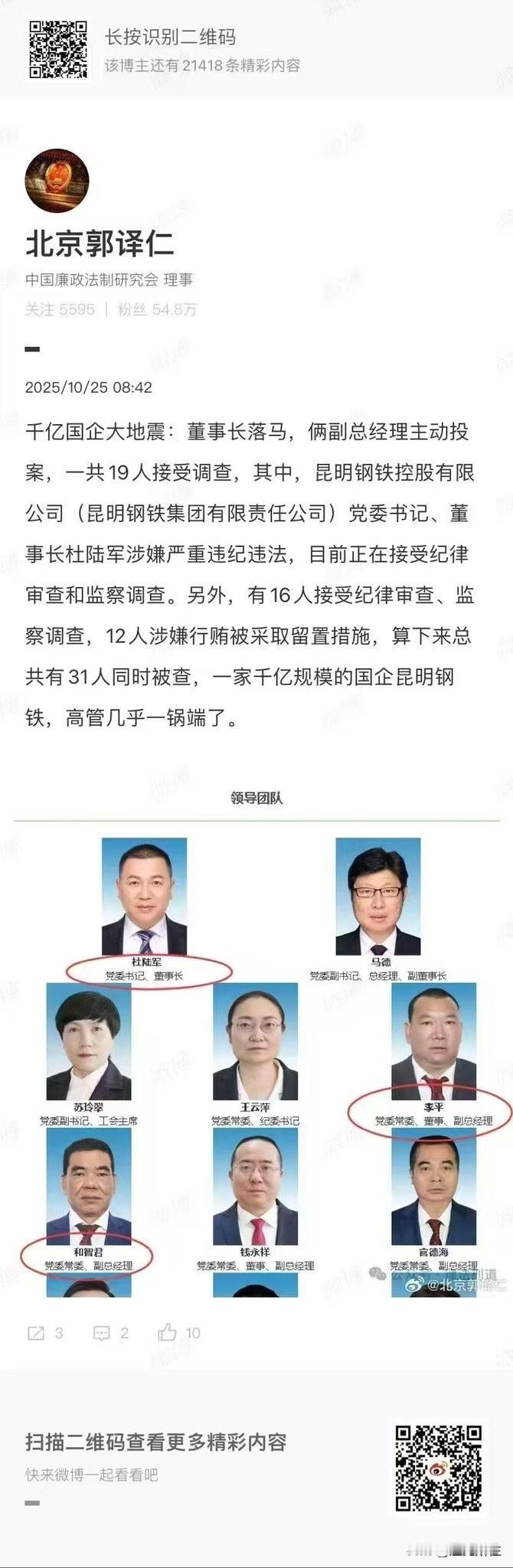 千亿国企大地震:董事长落马,俩副总经理投案,一共19人接受调查。12人涉嫌行贿被采取留置措施,算下来总共有 31人同时被查,一家千亿规模的国企昆明钢铁,高管几乎一锅端了。