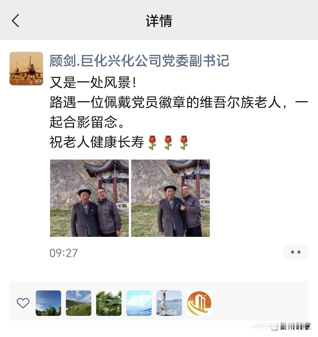巨化集团公司兴化公司党委副书记顾剑同志在新疆疗休养时,路遇一位佩戴党员徽章的维吾尔族老人,两位党员一起合影留念。 祝老党员健康长寿[玫瑰][玫瑰][玫瑰]巨化 你赞成党员一律佩戴党徽出门吗 你如何看待党徽大叔再护边疆誓言 万人说新疆·乌鲁木齐