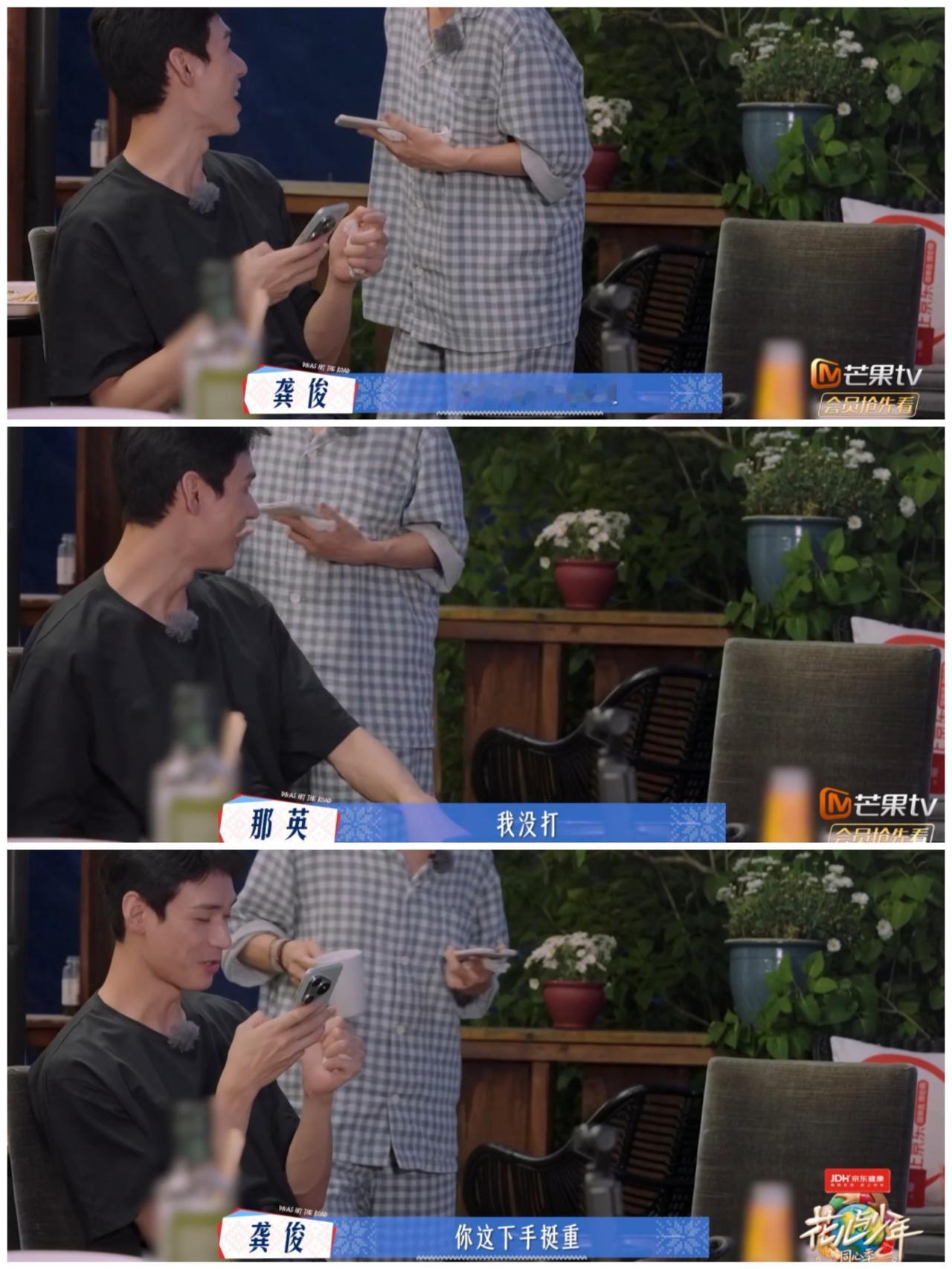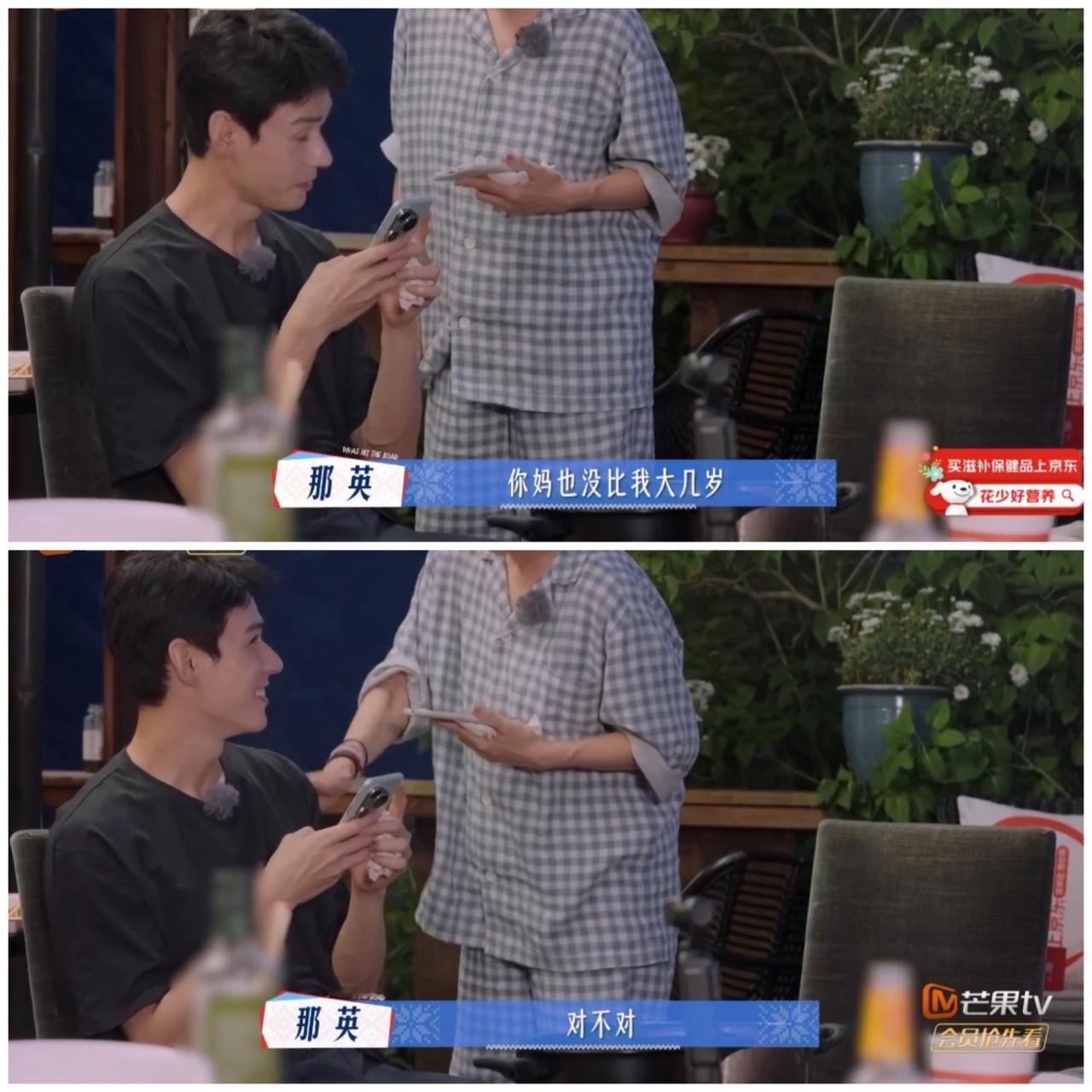 马思纯这样说, 一点都不怕那英翻脸, 旁边的龚俊没有反应过来, 就被那英“打”了。 马思纯突然吐槽那英的睡衣 跟她妈妈一模一样。 那英不但没有生气, 而且补充道, 马思纯妈妈没有比她大几岁。 更加绝的是, 那英突然走到龚俊身边, 龚俊正在看手机, 那英就“啪”的一声, 就拍了龚俊一下。 那英追问龚俊, 自己是否跟她妈妈差不多大。 面对这样的“死亡”问题, 龚俊久久不知道如何回答。 于是转移话题, 就假装被那英那一下打疼了, 吐槽她下手挺重。 看来马思纯和那英关系太好了, 敢直接吐槽她的衣服跟她妈妈一样, 不过换一个角度想, 也许那英给马思纯的感觉 就像妈妈般温暖吧。 那英敢在龚俊身上拍一下, 龚俊也不生气, 还各种吐槽, 打打闹闹。 这一刻, 他们真的很像“家人”, 什么话都敢说, 都不会害怕对方生气。 那英也是一点架子都没, 没有避讳自己的年纪, 坦言自己的年纪大到可以 做龚俊,马思纯的妈妈了。 别的艺人都努力给自己减年纪, 那英倒好, 直接给自己加年纪了, 把“姐姐”升级为“妈妈”。