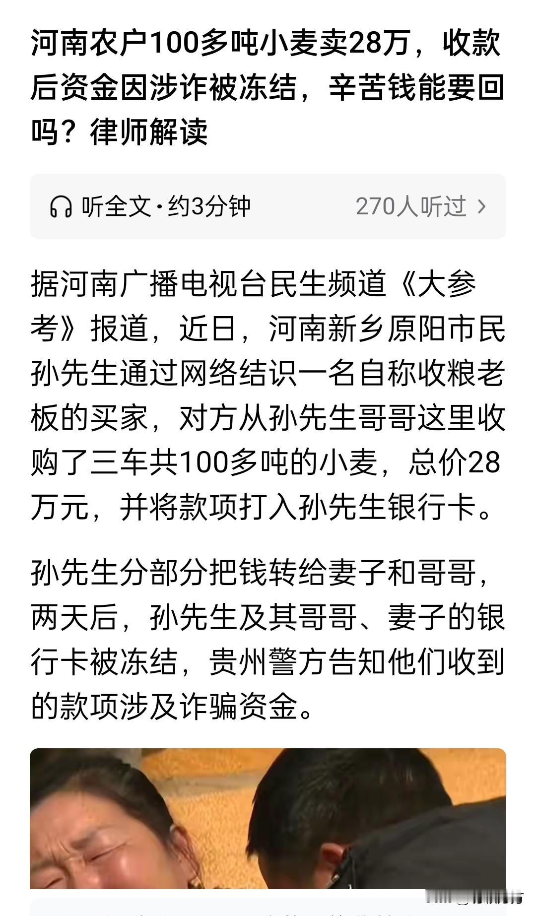 河南农户卖了100吨小麦收款28万元,但很快相关银行账户被警方冻结,因为该款项涉及诈骗资金。 同样的事情我也遇到过,一个朋友遭遇诈骗报警,因为之前曾和我们家有资金往来,所以我们的银行账号也被冻结了[捂脸]。虽然朋友向警方提供了口头和书面说明,证明我们和诈骗无关,但还是等了几个月才被解封。 我相信警方冻结银行账户会有法律依据,解封也需要有一定的流程,对于一个案件来说个人的小户头很自然地不会分配太多精力,但是对于当事人来说却可能造成极大的不便。希望审核流程能尽量加快,确定款项处理意见,让农户回归正常生活。[祈祷]