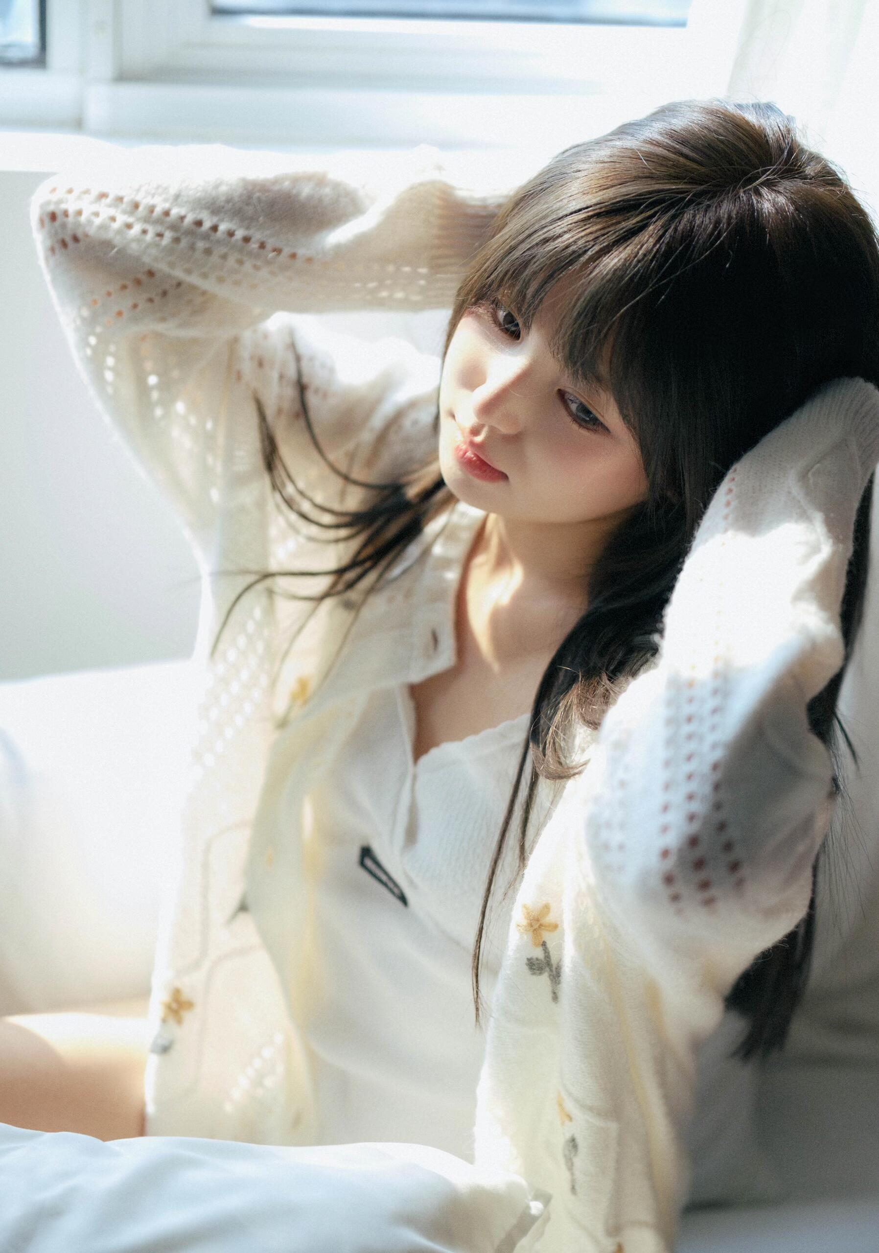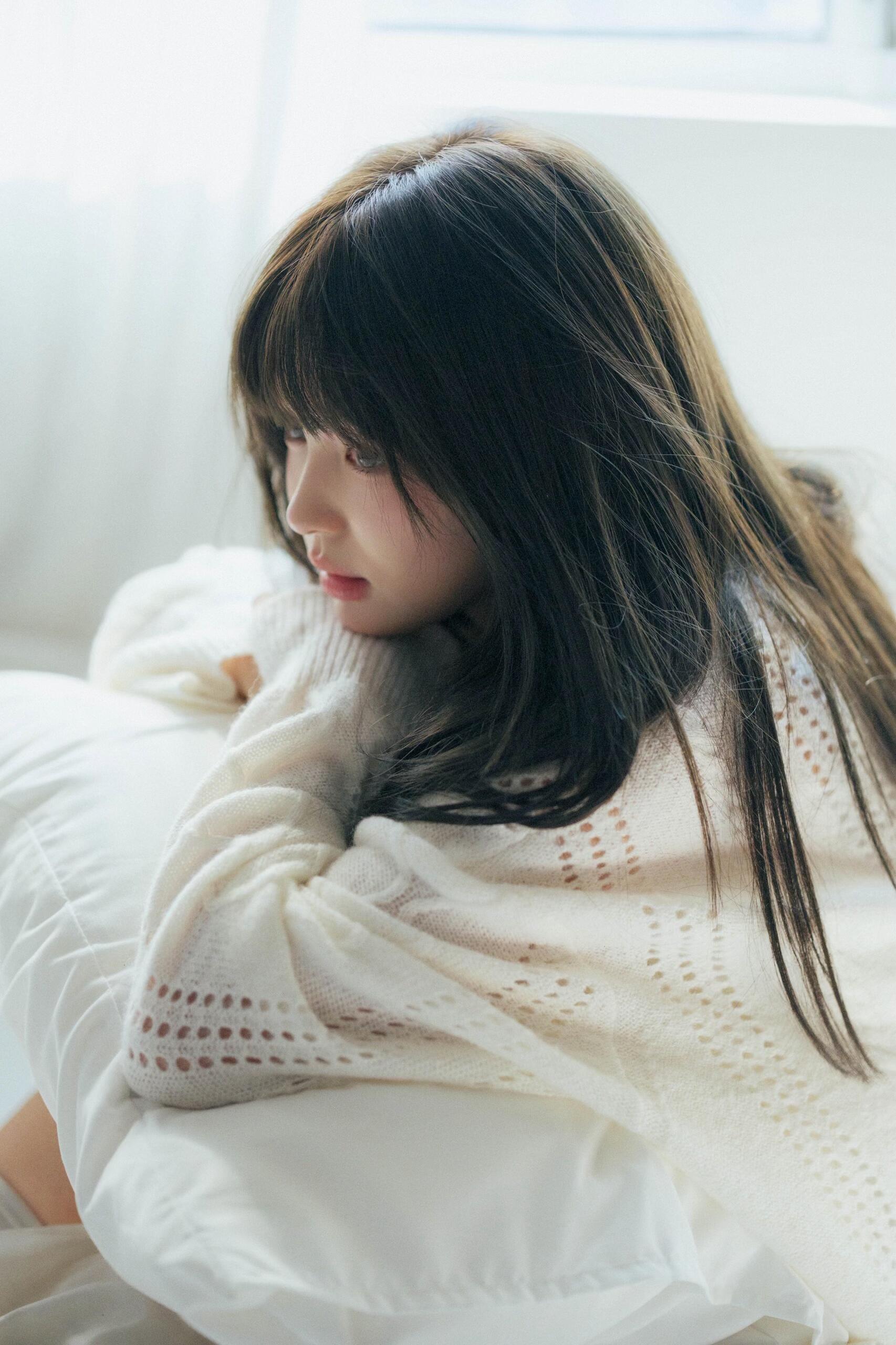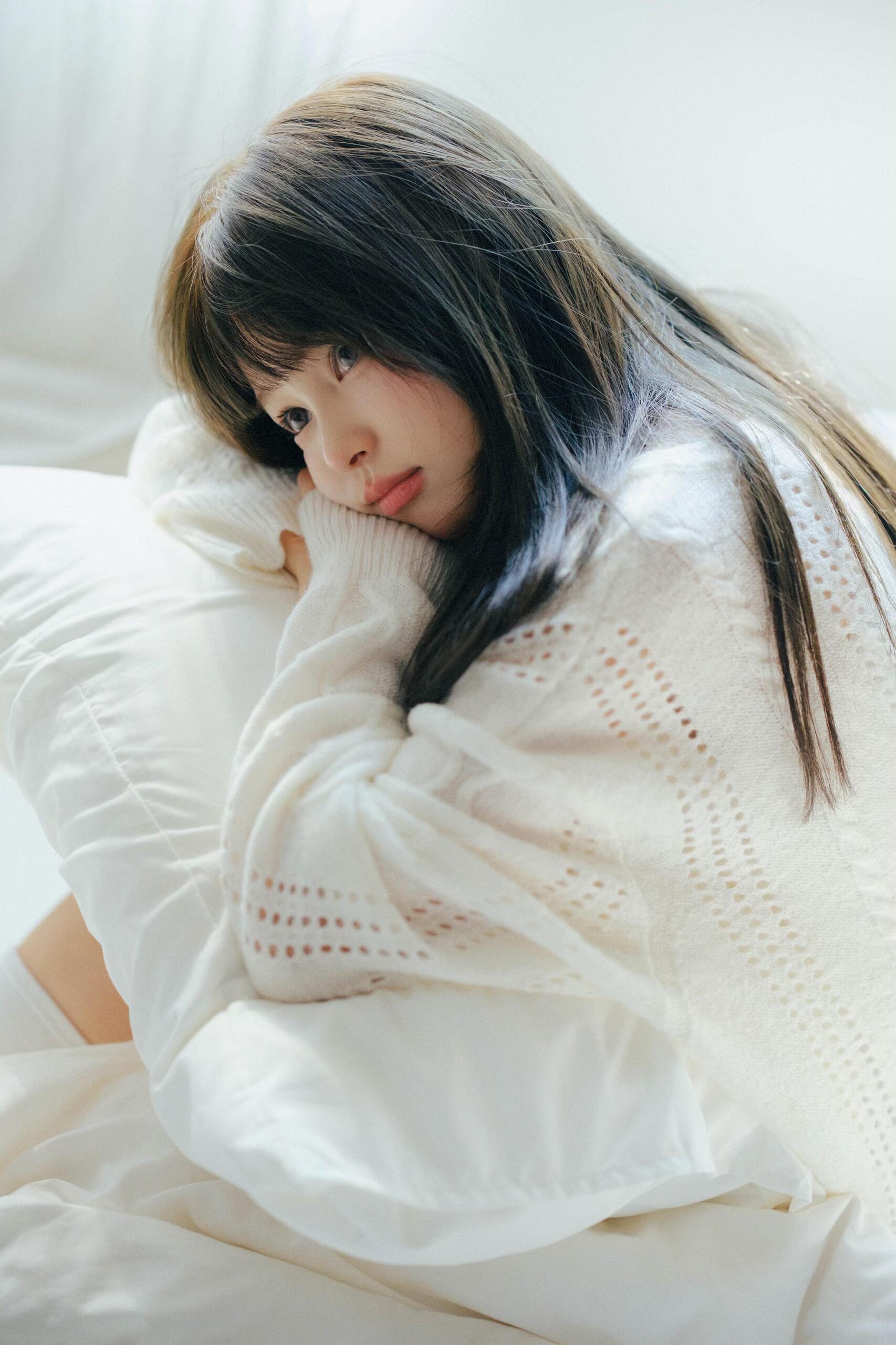 这组作品将“光”与“白”的质感交响演绎得淋漓尽致。白色的服饰、道具在光线的作用下,呈现出不同的质感表达,让画面充满了可触摸的细腻感。   白色针织开衫的镂空处,光线穿透形成的光斑;白色床品褶皱里,光线投射出的阴影;模特发丝间,光线勾勒出的丝缕光泽……这些细节都在诉说着光与白的质感对话。模特的妆容也与这一主题高度契合,清透的底妆、自然的唇色,没有过多色彩的干扰,进一步强化了光与白的质感呈现。   这种质感的表达,让作品跳出了“好看”的表层,进入了“可感知”的深层。观者仿佛能触摸到针织开衫的柔软,感受到床品的蓬松,体会到光线的温暖,最终在这种质感的交响中,沉浸于作品所营造的温柔世界里。