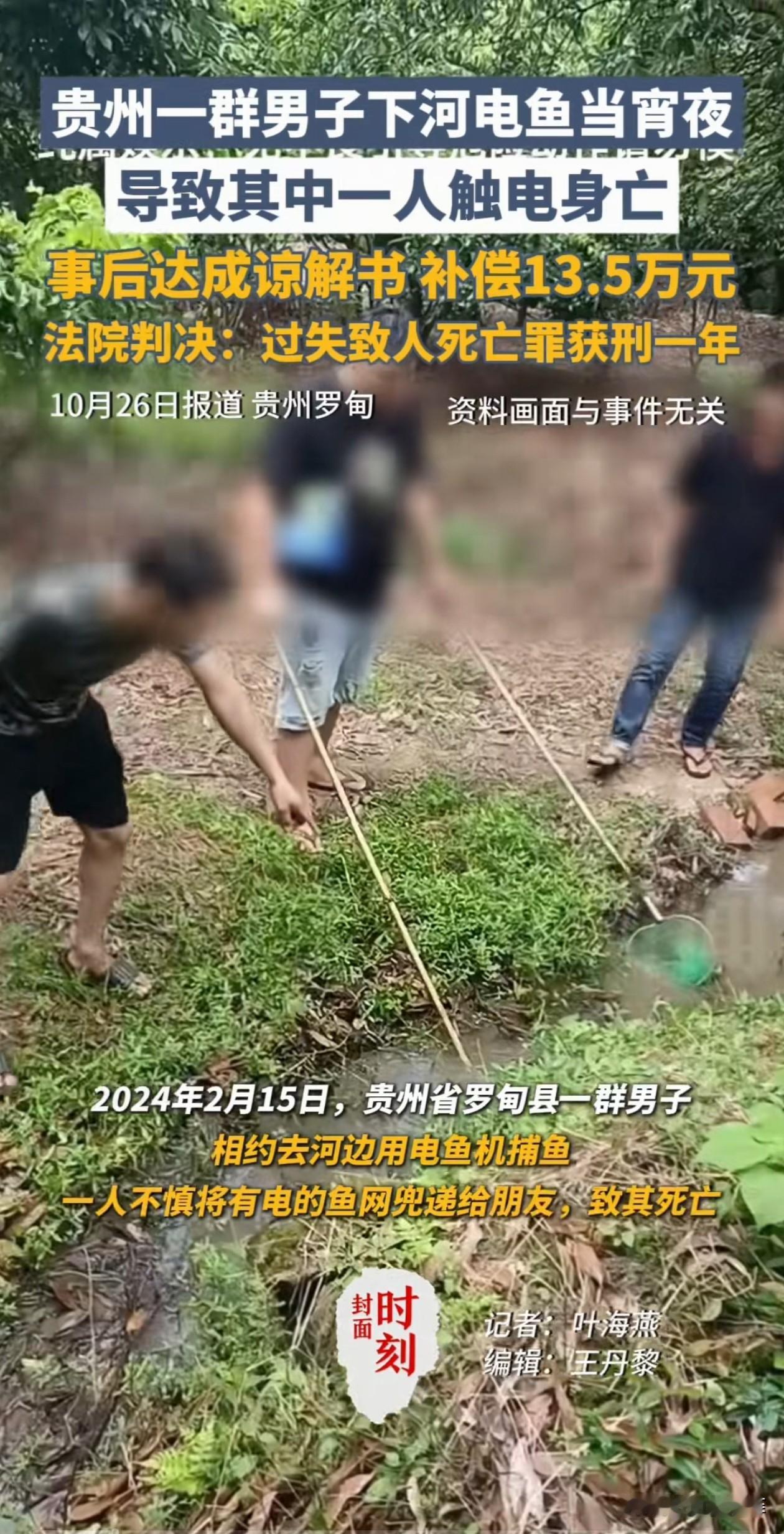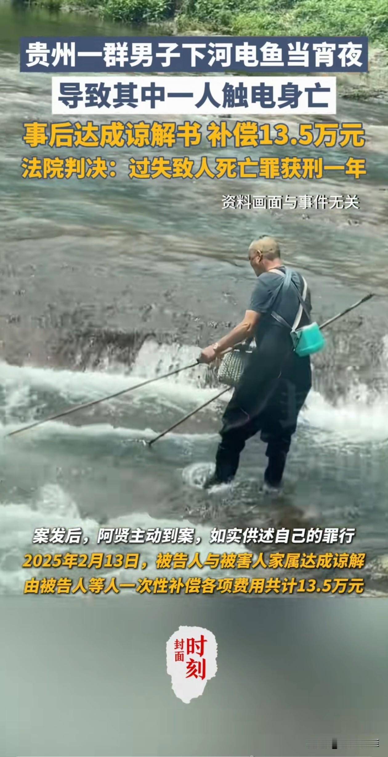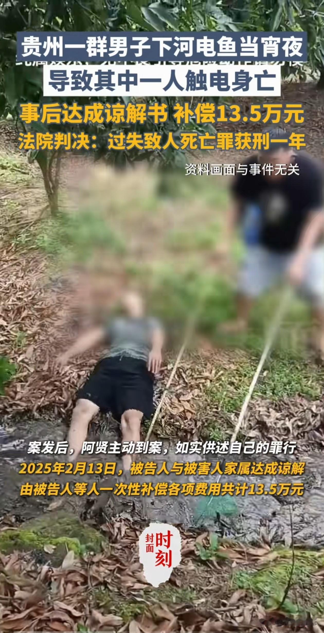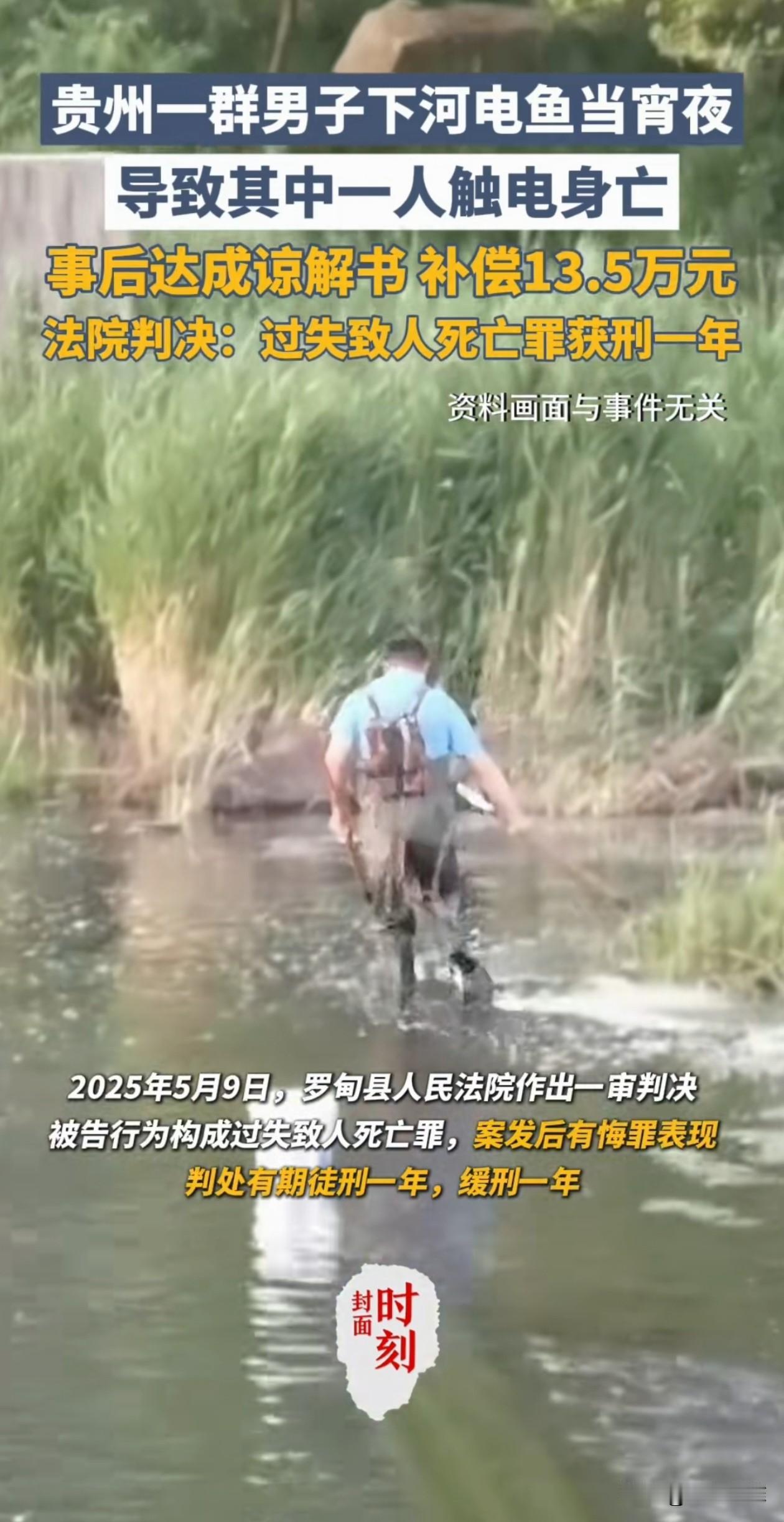 男子和朋友一起下河电鱼,男子打了第一网鱼后,没有确保电鱼机断电,就把网兜递给了朋友,朋友伸手去接,瞬间就被电倒在水里,最后不幸去世。法院:有期徒刑1年,缓刑1年。 贵州,去年2月份,男子和其他4个朋友一起吃饭喝酒。饭后,其中一个朋友提议用电鱼机去打鱼做宵夜,大家觉得可行,就在当地一个村民家借来了电鱼机。 ​ 男子用完电鱼机没有确保电源关闭,就直接递给了朋友,朋友伸手去接,碰到了网兜里面的铁圈,瞬间就被电倒在水里。 剩余同伴看到后,马上把朋友从水里拉起来,送往医院抢救。但是很不幸,朋友因为电击伤太重,去世了。 事后,男子主动报了警,如实说了事情经过。 今年2月,男子和其他三人一起,跟朋友的家属商量,达成了谅解协议书,还一次性给了家属13.5万元作为补偿。 5月,法院一审,判男子有期徒刑1年,缓刑1年。 有网友觉得判一年还缓刑,这惩罚太轻了,起不到警示作用,哪怕是不小心,后果这么严重,判得应该再重点。 也有网友认为男子不是故意的,是一时疏忽,而且他后来主动去自首,还赔钱得到了家属原谅,法院考虑到这些情况,判决也合理。 电鱼这种行为不仅违法,还非常危险,很容易造成不可挽回的后果,千万不能为了一时的口腹之欲或者好玩,就去做这种危险又违法的事情。