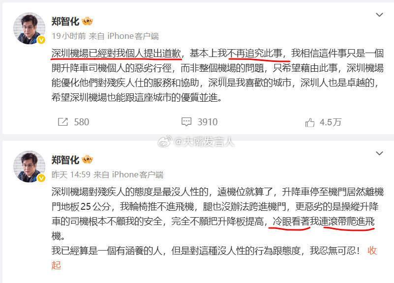 机场安检,道理就是默认每人都有可能是罪犯,要把危险提前排除,郑智化最新一条微博,这一句显然是为批而批了,“我尊重機場安檢必須嚴密,但是殘疾人也是人,我們是旅客不是罪犯!”[怒][怒]