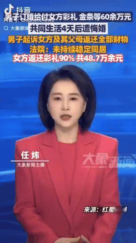 江西抚州,一男子订婚给女方彩礼,加上金条一共花了60多万元,没想到两人仅同居了4天,女方就悔婚,男子没办法就和女方商议退婚,不料女方却只想退一半彩礼,男子只好将对方告上了法院,最终法院这样判了! 信息来源:大象新闻 今年2月,38岁的吴先生在家人和媒人的撮合下,认识了同为江西抚州金溪县户籍的周小姐。 相处不到一个月,两人就办了订婚,3月5日那天还弄了个热闹的仪式。 仪式上,吴先生一下子掏出了38.8万现金彩礼,见面礼6万,还给周小姐家里长辈包了5.7万红包;为女方本人还送了价值7.02万的金条和3000元的戒指,差不多花了60万。 订完婚,吴先生去了浙江宁波打工,俩人一人南一人北。 4月25日,周小姐突然跑到宁波来,“考察”同居生活,结果呆了4天就说:我不想结婚了。 4月29日她回了金溪。 吴先生赶紧要退婚,还想拿回所有彩礼,周小姐却只肯退一半。 两人谈不拢,吴先生只好上了法院,把周小姐和她爸妈都告上去。 金溪县人民法院审理后说,俩人根本没领证,按照《民法典婚姻家庭编解释(一)》第五条,男方要返还彩礼,法院就应支持。 法官把那些给长辈的红包、节日礼、媒人费都算作普通赠与,不认作彩礼;把38.8万现金和彩礼性质的6万见面礼、以及金条和戒指一并认定为54万多元彩礼。 至于那4天小打小闹的同居,法院觉得谈不上长期稳定关系,不能因此减少返还。 女方说吴先生隐瞒收入、还有外债,也说他父亲要拿彩礼给儿子开店,法庭都没当回事。 最后,法院判周小姐返还90%的彩礼,也就是48.7万左右,还得把金条和戒指一并交回。 判决一出,引得不少人唏嘘:这么大的事儿,仅仅同居4天就黄了,男方要蒙受近50万损失,真是心疼他的腰包。 这事给大家提个醒:结婚前不要冲动给大额彩礼,要多点了解对方是否合适,相处好了再商量结婚的事情,不然一下子给大额彩礼,一旦对方几天说不合适就退婚,这样子吃亏的就是自己。 如果有大额转账一定要留好支付凭证,标注好用途,不要全部给现金,这样子才能最大限度地保护自己。