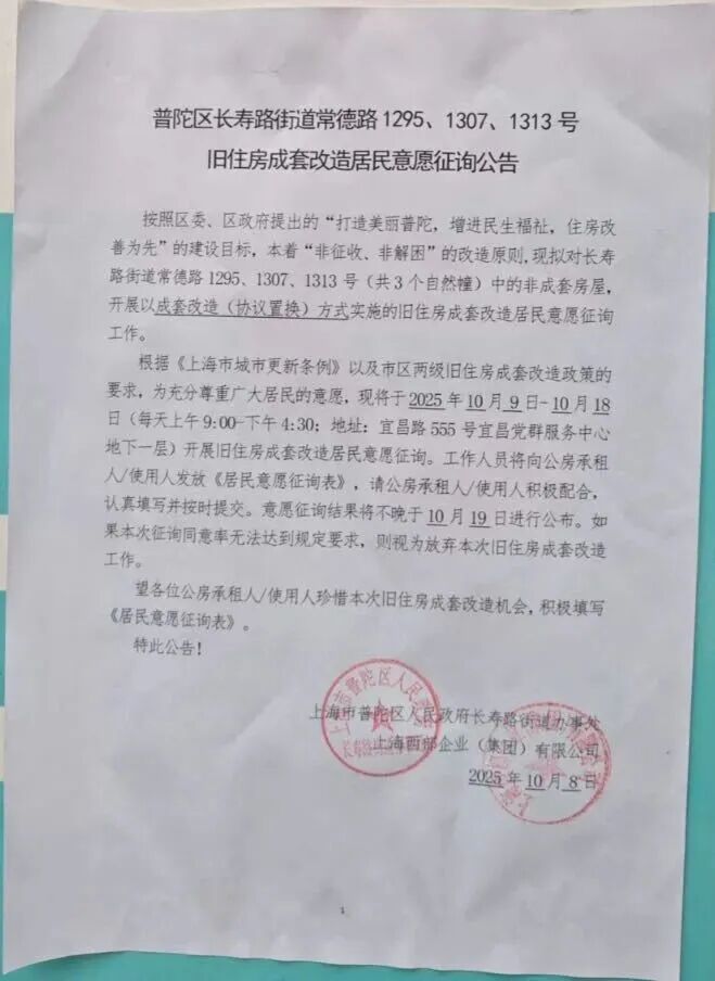 10月,普陀区正红里、常德路1295、1307、1313号以及长寿路535-565号等多个小区相继发布改造征询公告。