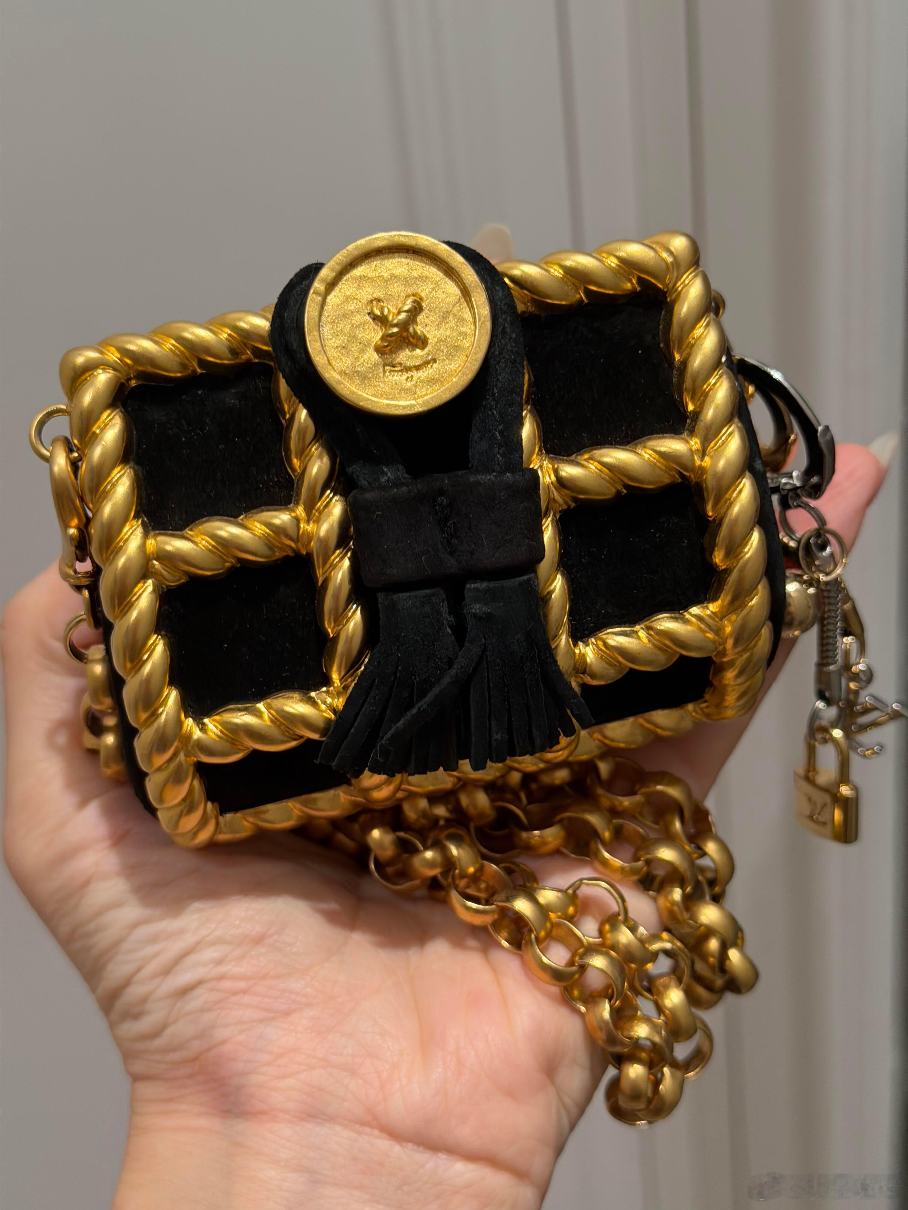 这款手提包以黑色绒面材质为基底,巧妙运用金色元素打造奢华质感。包身轮廓由精致的金色麻花状链条勾勒,正面饰有浮雕纹路的圆形金属扣饰,下方垂落着灵动黑色流苏。可调节的金色粗链条肩带兼具实用性与装饰性,末端悬挂的小锁挂件更添细节巧思。深色绒面与金属光泽形成鲜明对比,在模糊的都市光影背景衬托下,完美融合复古优雅与现代摩登,无论是手拎或斜挎都能成为造型的点睛之笔。时尚配饰