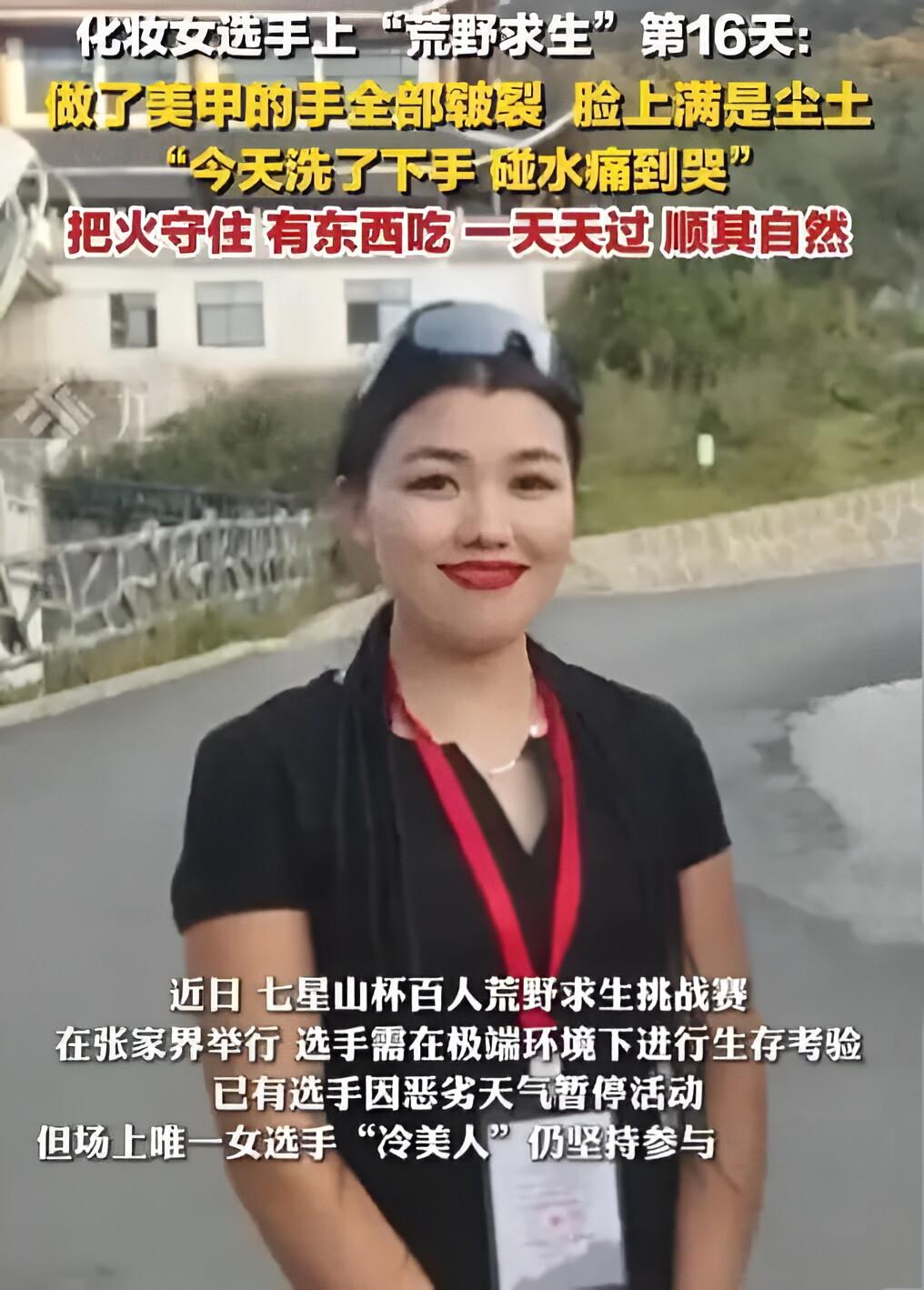 参加荒野求生14天,结果瘦成一道闪电。 比赛于2025年10月9日左右在张家界七星山景区开赛,近百名选手参加,每人仅凭一把柴刀等基础装备,在无外界补给的情况下挑战荒野生存。 目标是坚持最长时间者获胜,冠军可获20万元人民币奖励及荣誉证书。比赛分为半决赛和决赛,决赛要求在荒野中挑战40天,且半决赛物资不得带入。 选手需自行搭建庇护所、净化水源、寻找野外食材(如野果、野菜),生理和心理承受巨大压力。 杨朝芹(又称“冷美人”)是赛场上唯一坚持到后期的女性选手,熬过十几个雨夜,截至2025年10月24日(约第16天),她仍继续挑战,当时还有25名选手在坚持。 14天后,她体重急剧下降,外形“瘦成一道闪电”,手指和嘴唇干裂,面容憔悴,与赛前判若两人。她表示状态尚可,但方法“很危险,大家不用尝试”,并提到不认识所有野菜野果,需谨慎尝试以防中毒。丛林荒野求生 极限荒野求生
