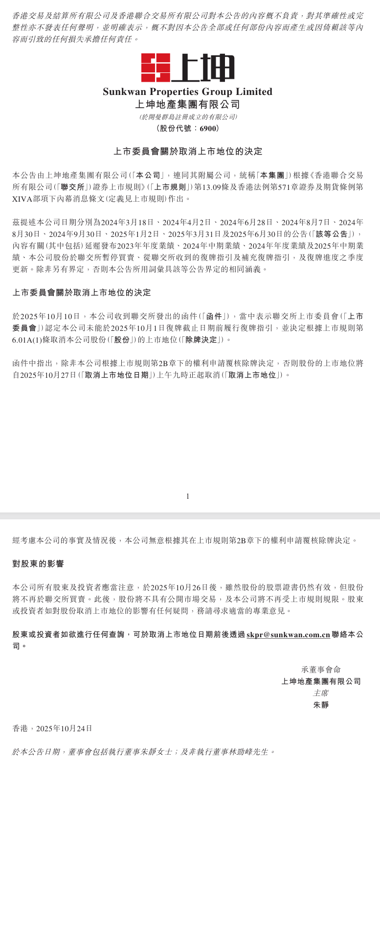 公告二:上坤地产集团有限公司(股份代号:6900)-被强制退市