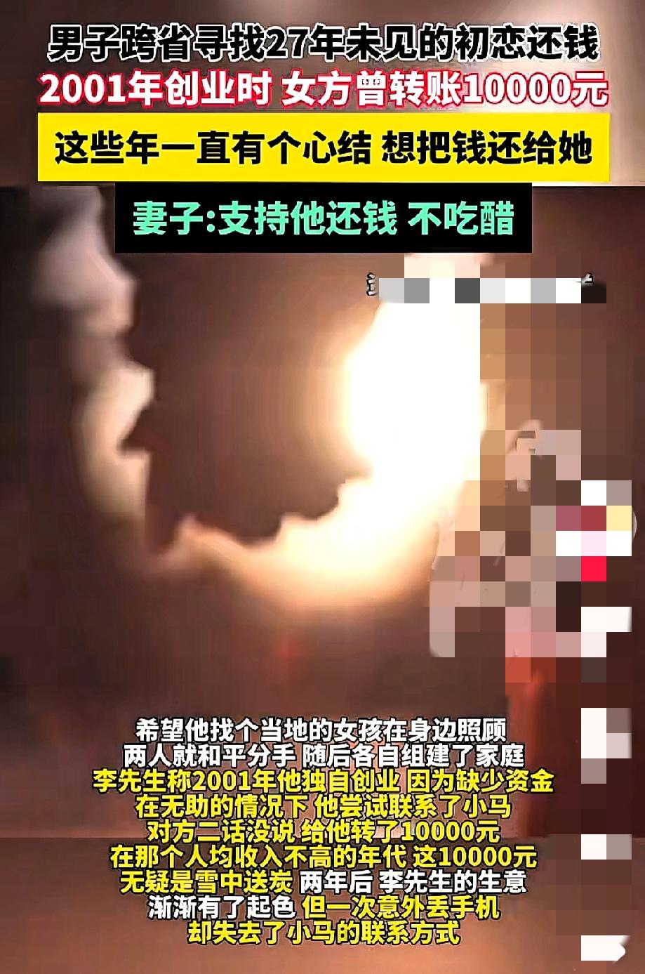 安徽男子寻初恋27年只为还1万块,这事儿比偶像剧还戳人!换别人早把这笔陈年旧账抛脑后,他却把“该还的情”记了大半辈子,连现任妻子都全力支持,这格局真少见。 别觉得这只是还钱那么简单,藏在背后的真诚才最难得。2001年创业缺钱,初恋二话不说递上1万;时隔27年,他事业稳了就执着寻人防,没因对方是前任就模糊底线,更没因时间久就赖账。这哪是还钱,是守住了成年人最该有的体面。 更难得是两个女人的通透:初恋念旧情伸手帮衬,不掺私心;现任懂信任不瞎猜忌,全力支持。没有狗血拉扯,只剩互相体谅的真诚。现在总说人情淡,可这事儿藏着答案——真诚从不会过期,欠的账要还,守的信要认。 你要是遇到这种事,会支持伴侣找前任还旧账吗?换作你,能做到这份体面和信任吗?如何用方言表达“吝啬”呢? 相亲女孩,彩礼要61800多吗 男子跨省来河南找27年前初恋还钱 忘记一个喜欢的人是什么感觉? 大龄剩女后果是什么? 谈宠物在生活中的作用 哪一个瞬间,你的世界观改变了 相亲女孩什么都不要,正常吗 江苏启东观光车事故会对当地旅游业有何影响 你看过哪些经典的电影 大家对大龄剩女现象有何见解呢? 你认为宠物对人的生活有何影响? 为啥穷人的财富很难长久? 要求相亲男必须有房,不对吗?