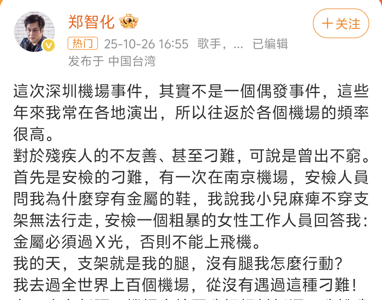郑智化 深圳机场为什么郑智化到哪里安检都要检查金属支架?因为很多年的一次劫机事件就是伪装成拐杖带上飞机的。一视同仁,互相体谅吧!别把问题政治化!
