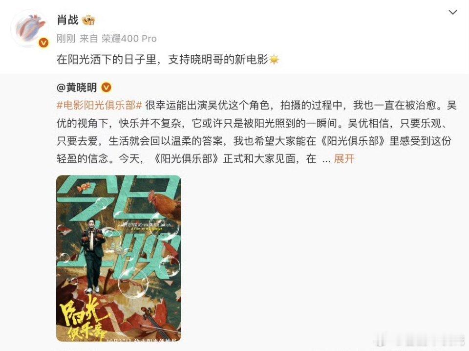 肖战宣传黄晓明新片啦[比耶][比耶][比耶]这个宣传委员肖战永远准时在线[比耶][比耶][比耶][比耶][比耶][比耶]支持小明哥新片[污][污][污]